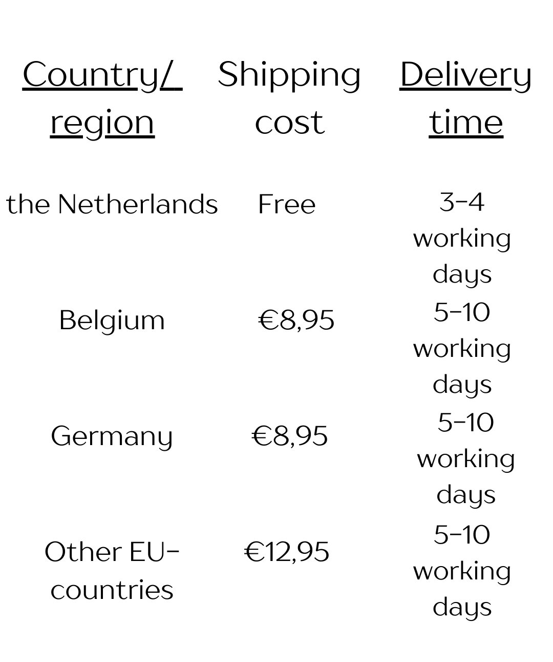We do our best to deliver your order as quickly and carefully as possible. Orders are processed with care and shipped via reliable carriers. Below you will find an overview of the shipping costs and estimated delivery times per destination.