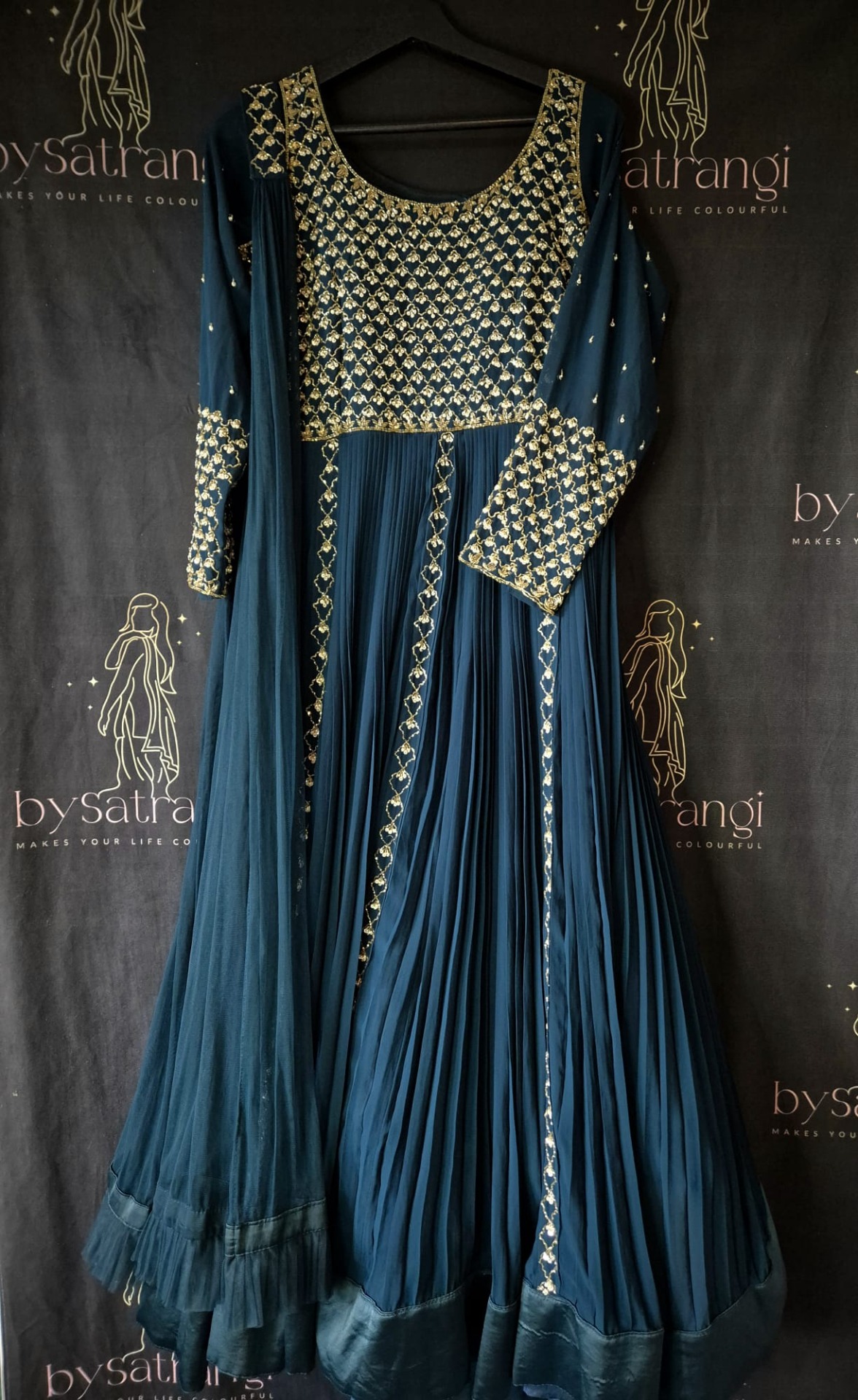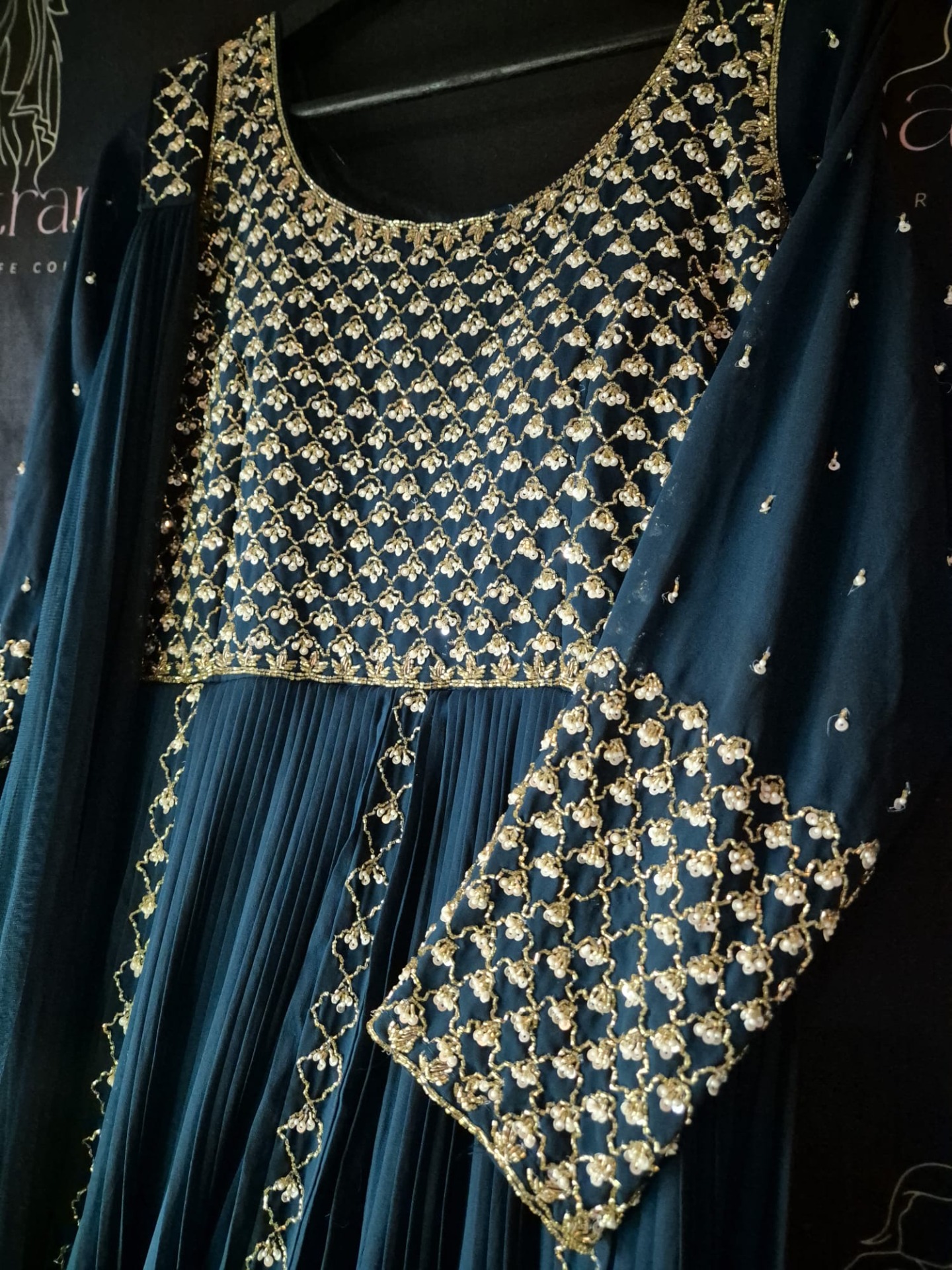 Embroidery: Rich gold-toned embroidery featuring refined geometric patterns on the bodice and sleeves. Elegant embroidered panels extending vertically through the skirt.