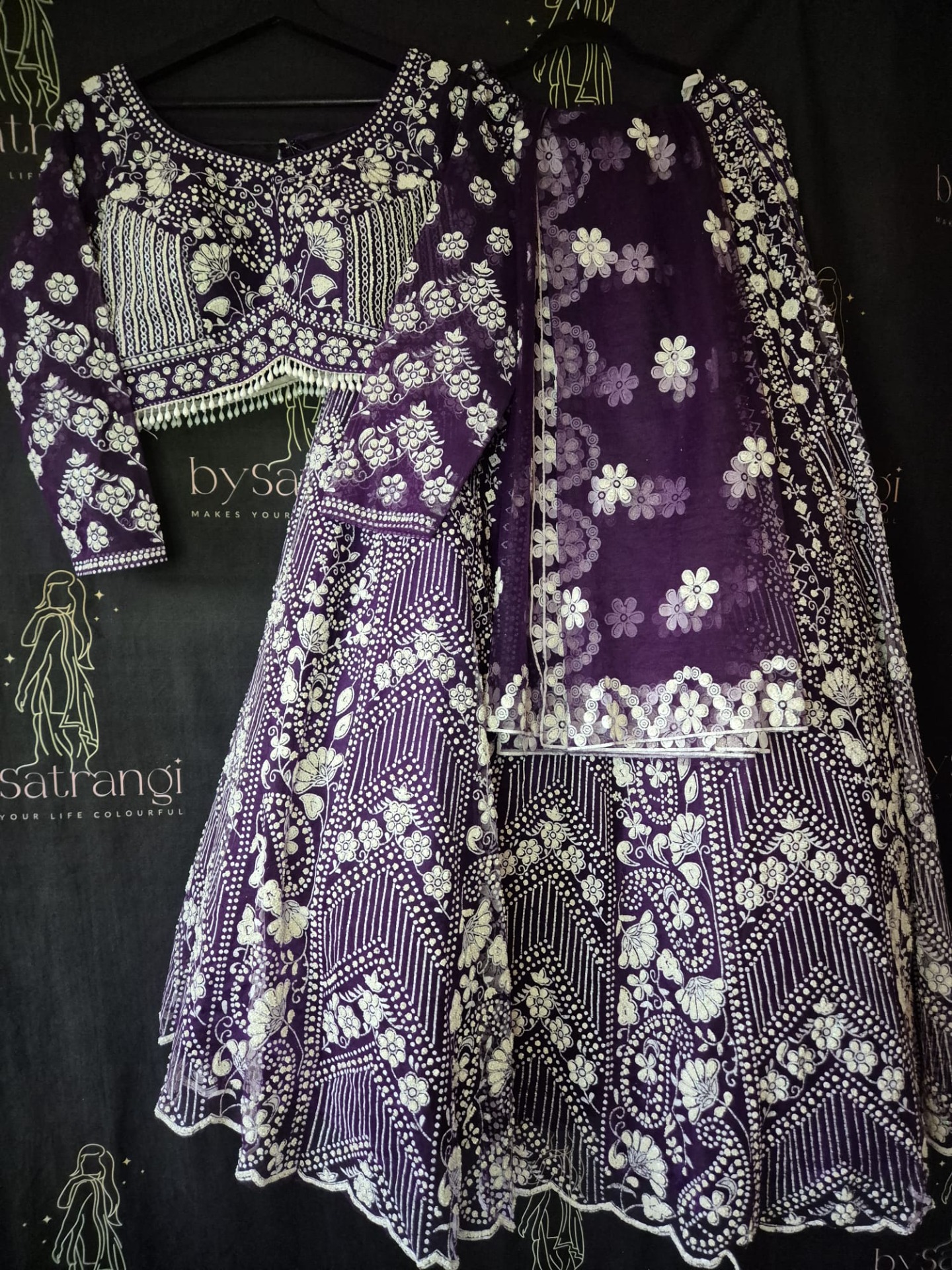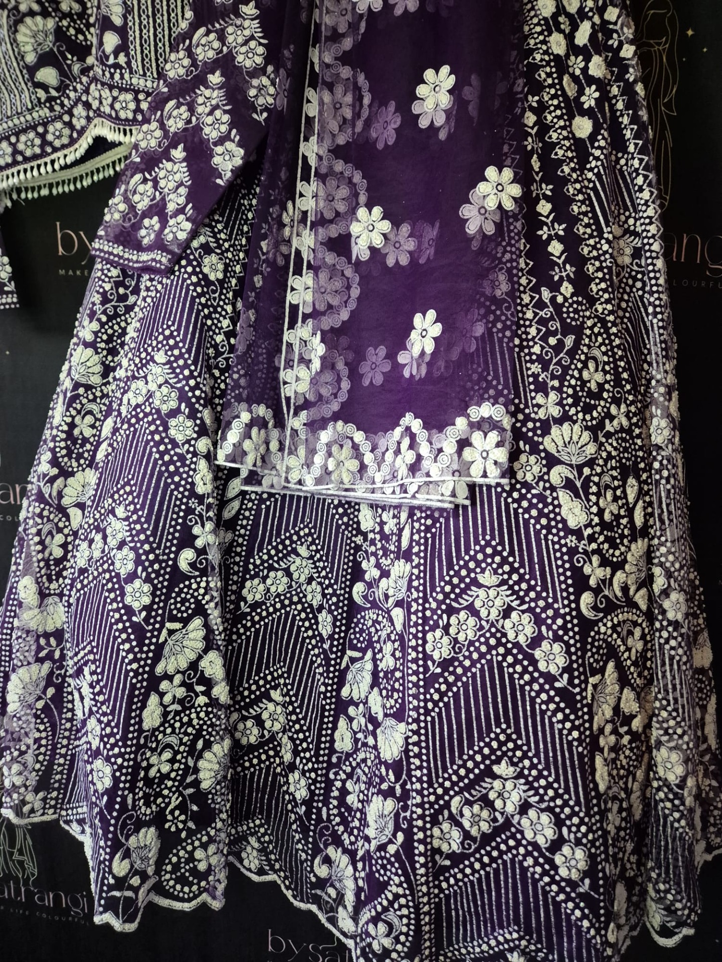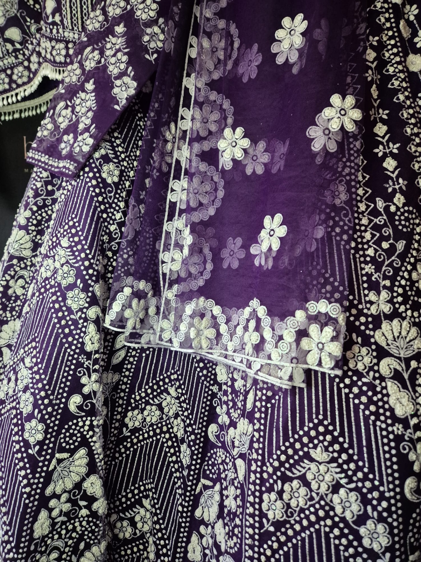 Embroidery: Intricate white embroidery featuring floral motifs and geometric patterns. Finished with decorative borders and refined detailing on the top, skirt, and dupatta.
