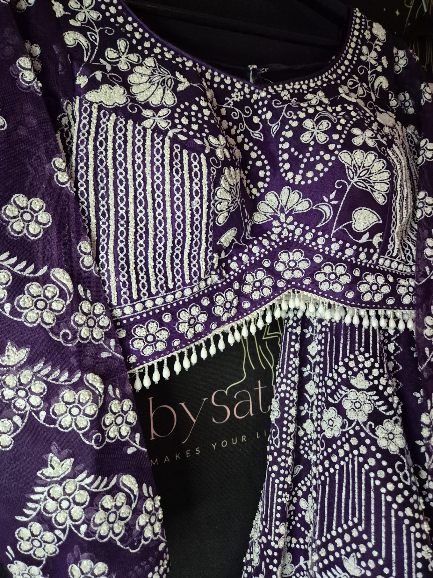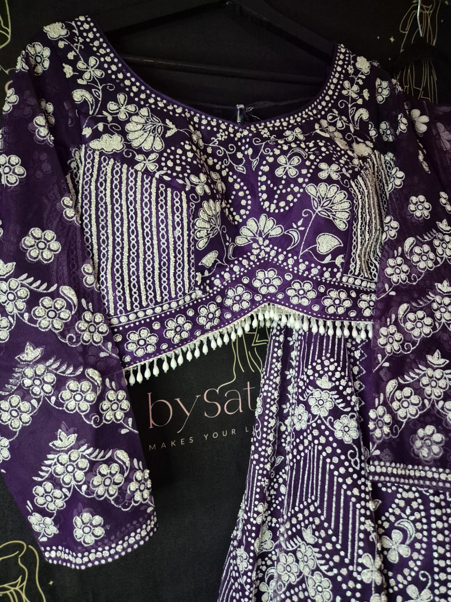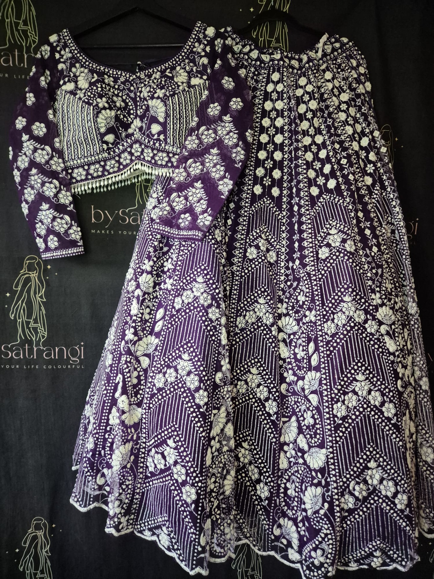 Embroidery: Intricate white embroidery featuring floral motifs and geometric patterns. Finished with decorative borders and refined detailing on the top, skirt, and dupatta.