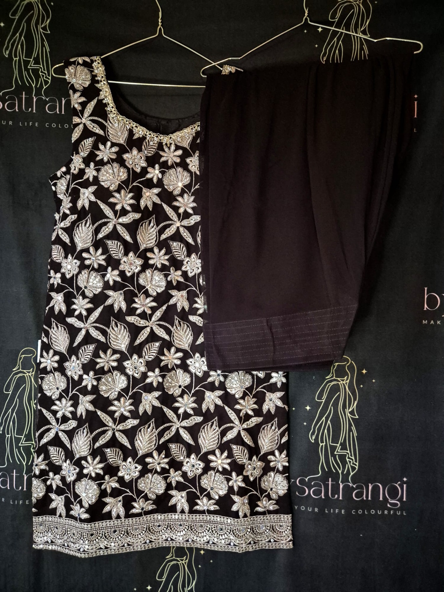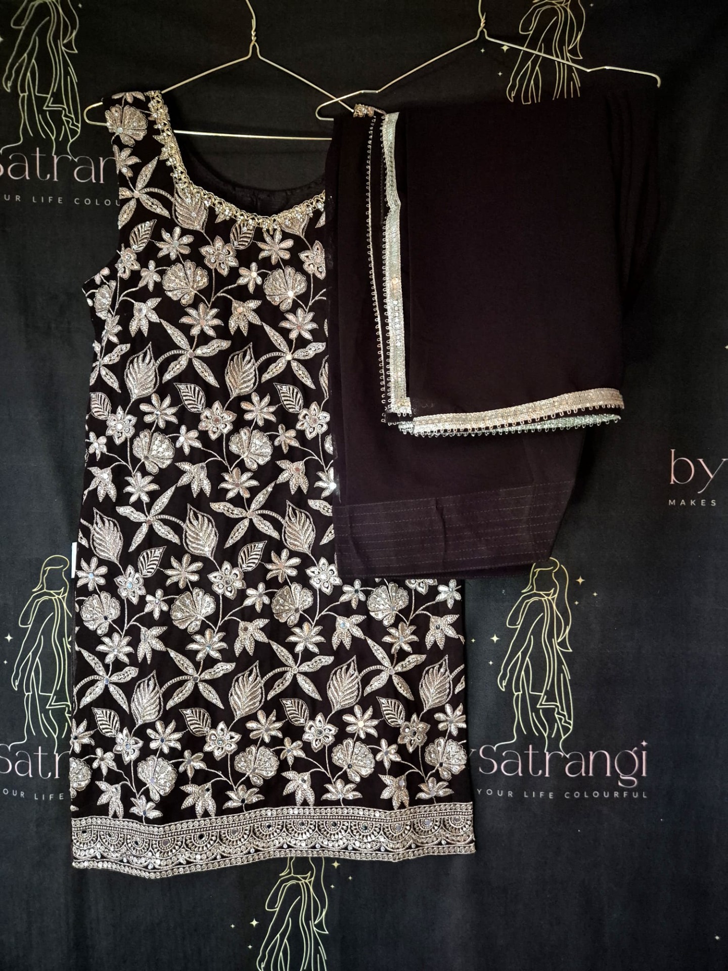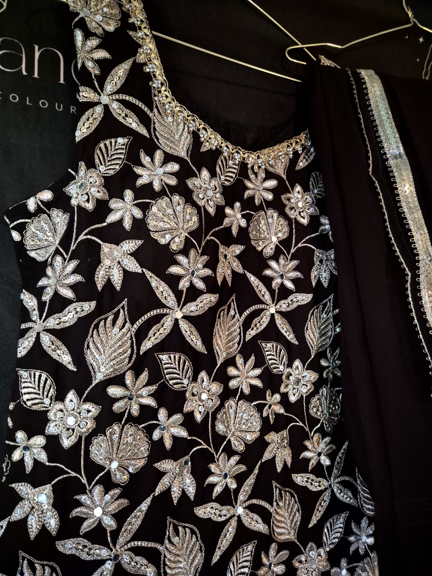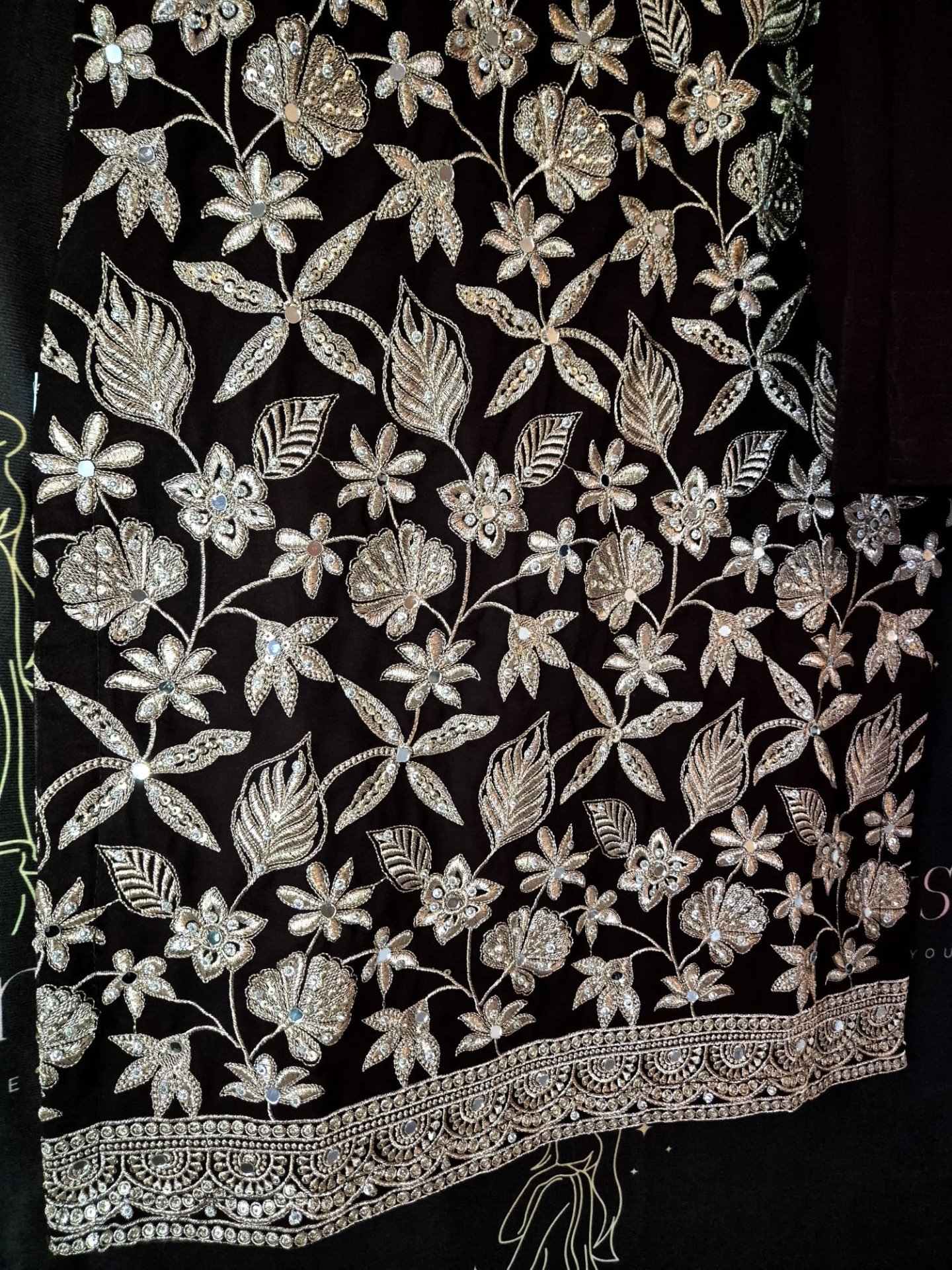Embroidery: Rich silver-toned embroidery featuring intricate floral and leaf motifs across the top. Finished with a detailed decorative hem and elegant borders on the dupatta, creating a luxurious and festive look