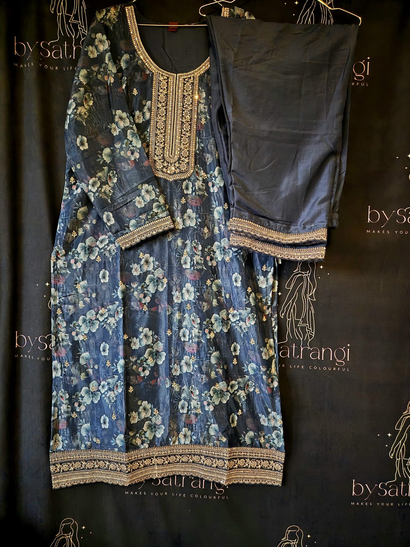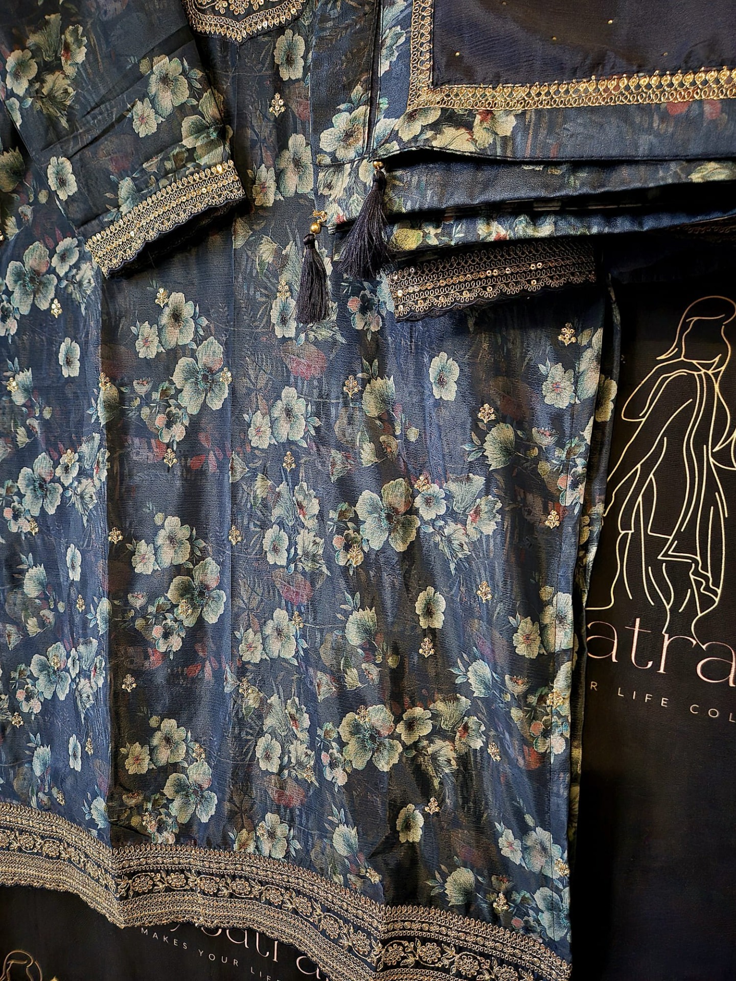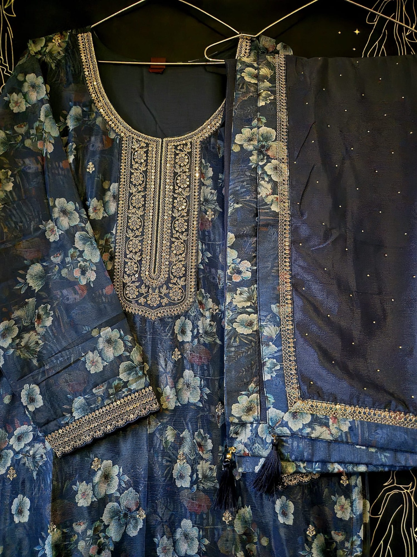 Embroidery: The neckline is elegantly finished with gold-toned embroidery and delicate embellishments. The top features an all-over floral print with a richly decorated hemline. The dupatta is adorned with subtle shimmer accents and a refined border.