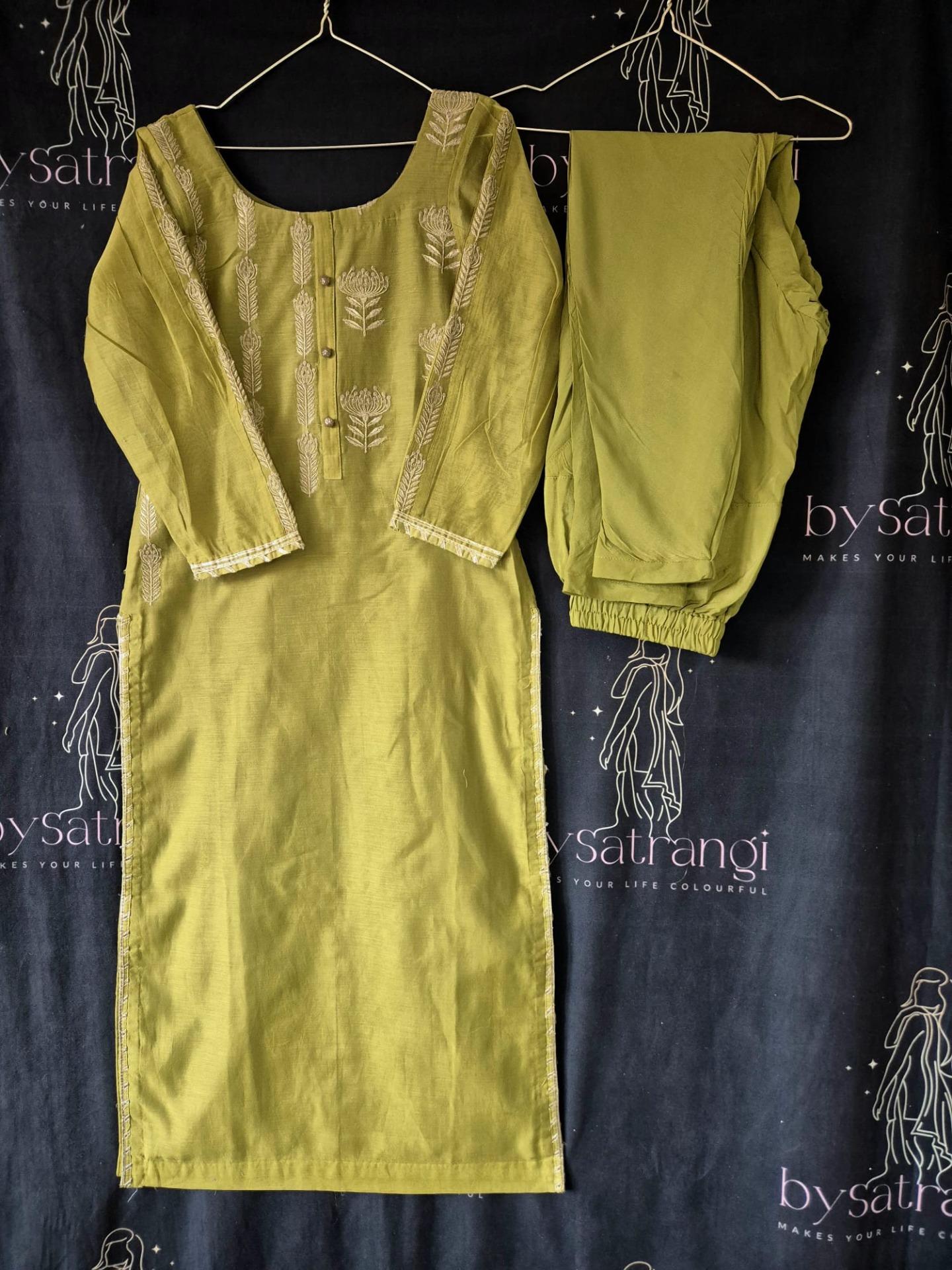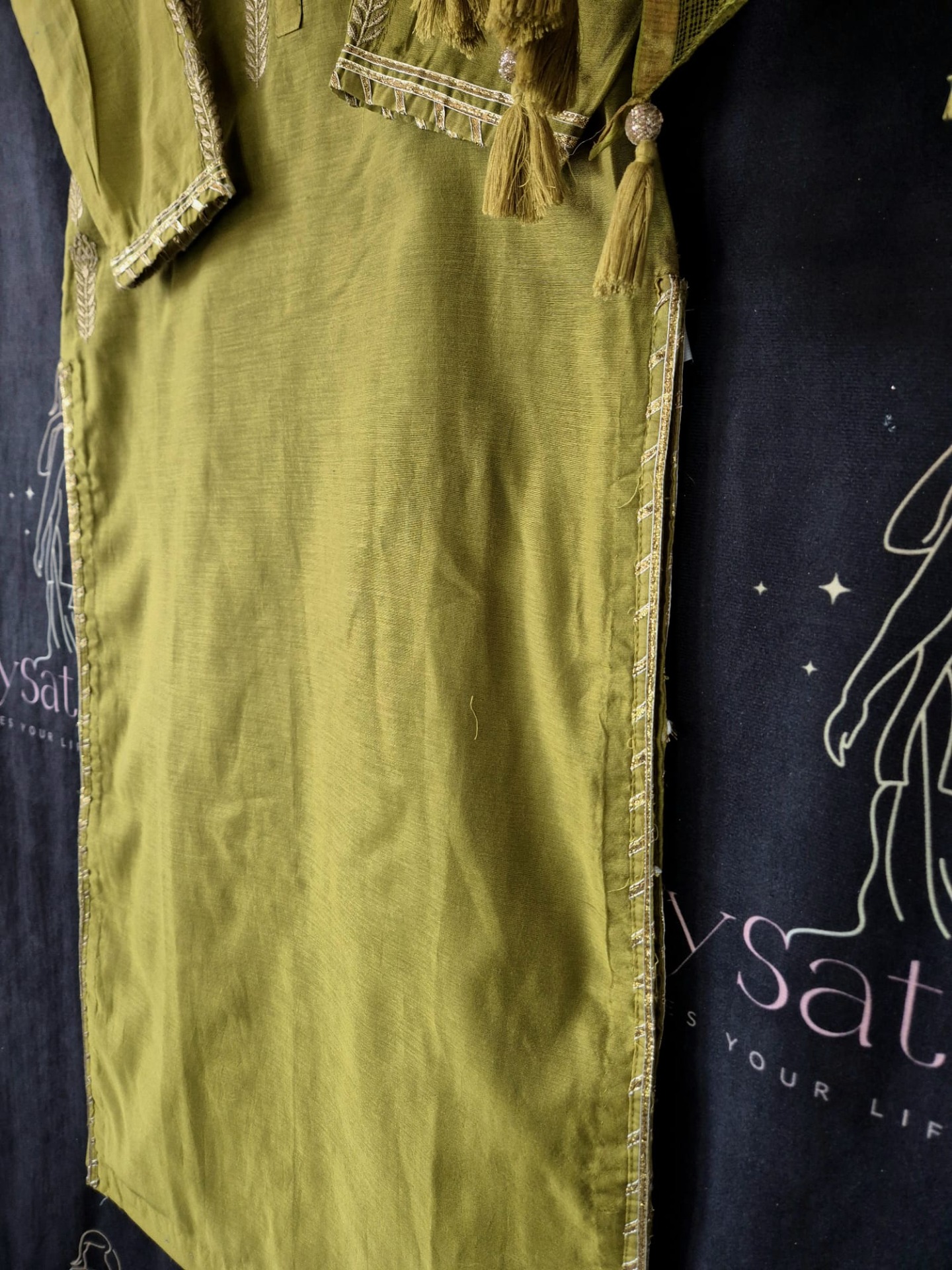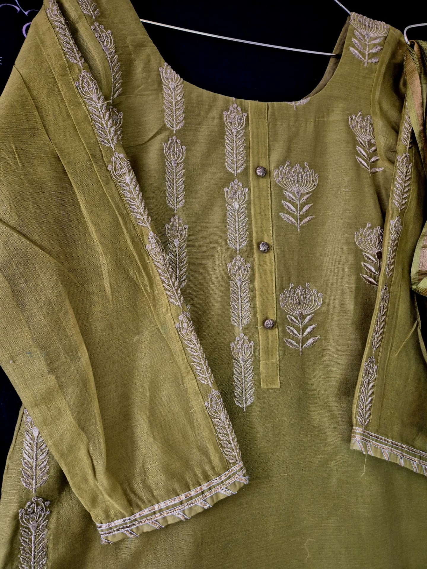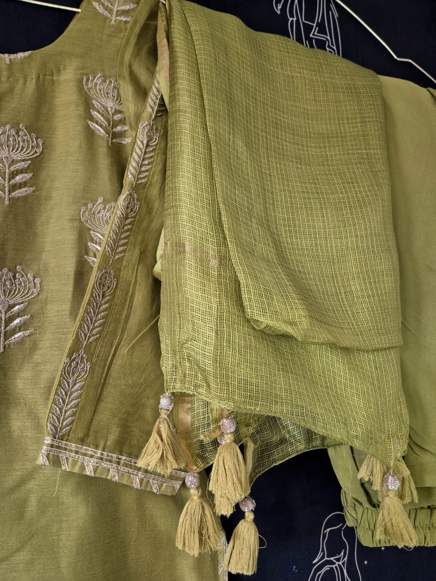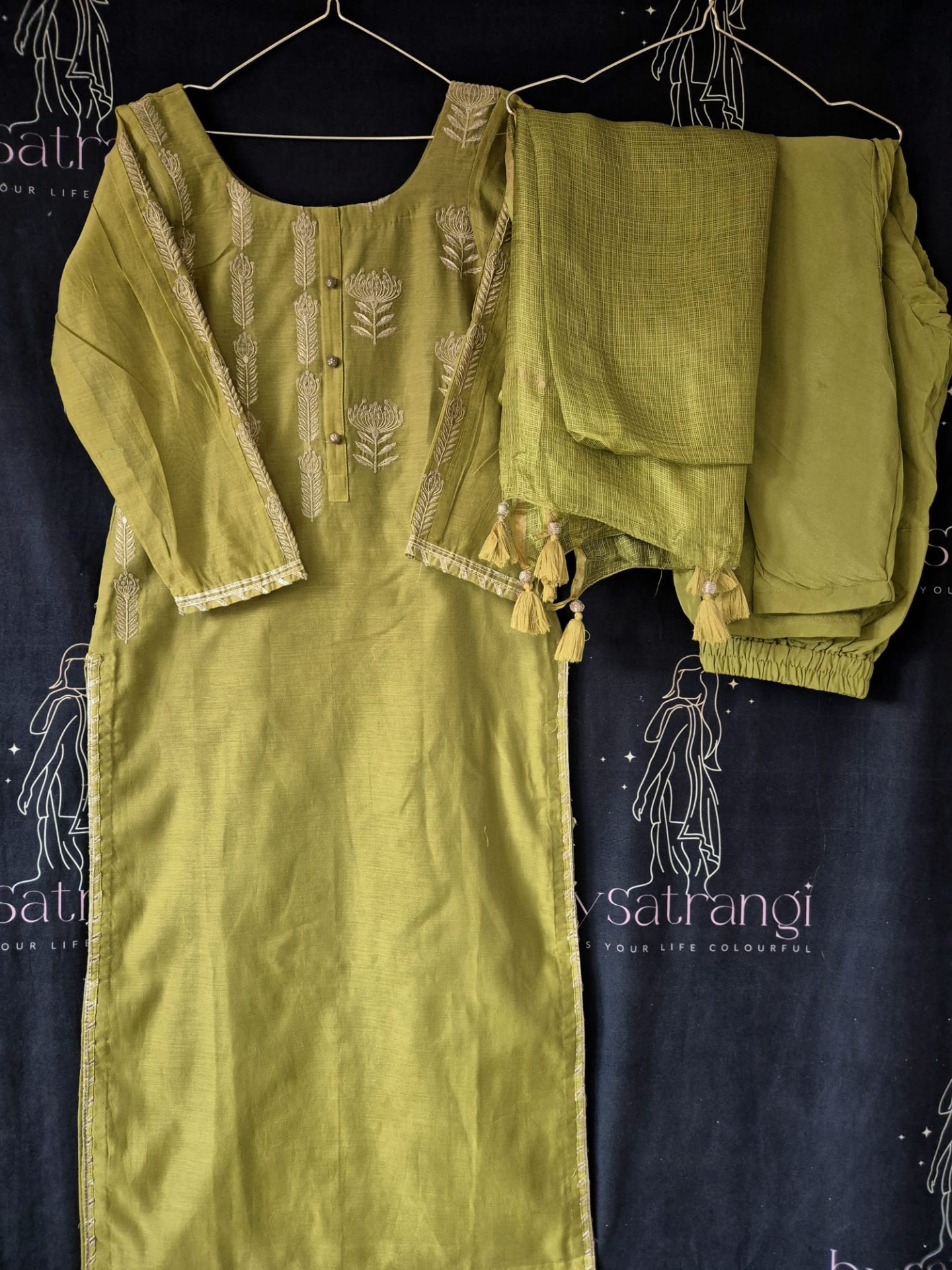 Embroidery: The top is finished with elegant thread embroidery featuring vertical floral and leaf motifs along the neckline. The sleeves are detailed with matching embroidery . The dupatta is kept minimal and completed with playful tassel accents at the ends.