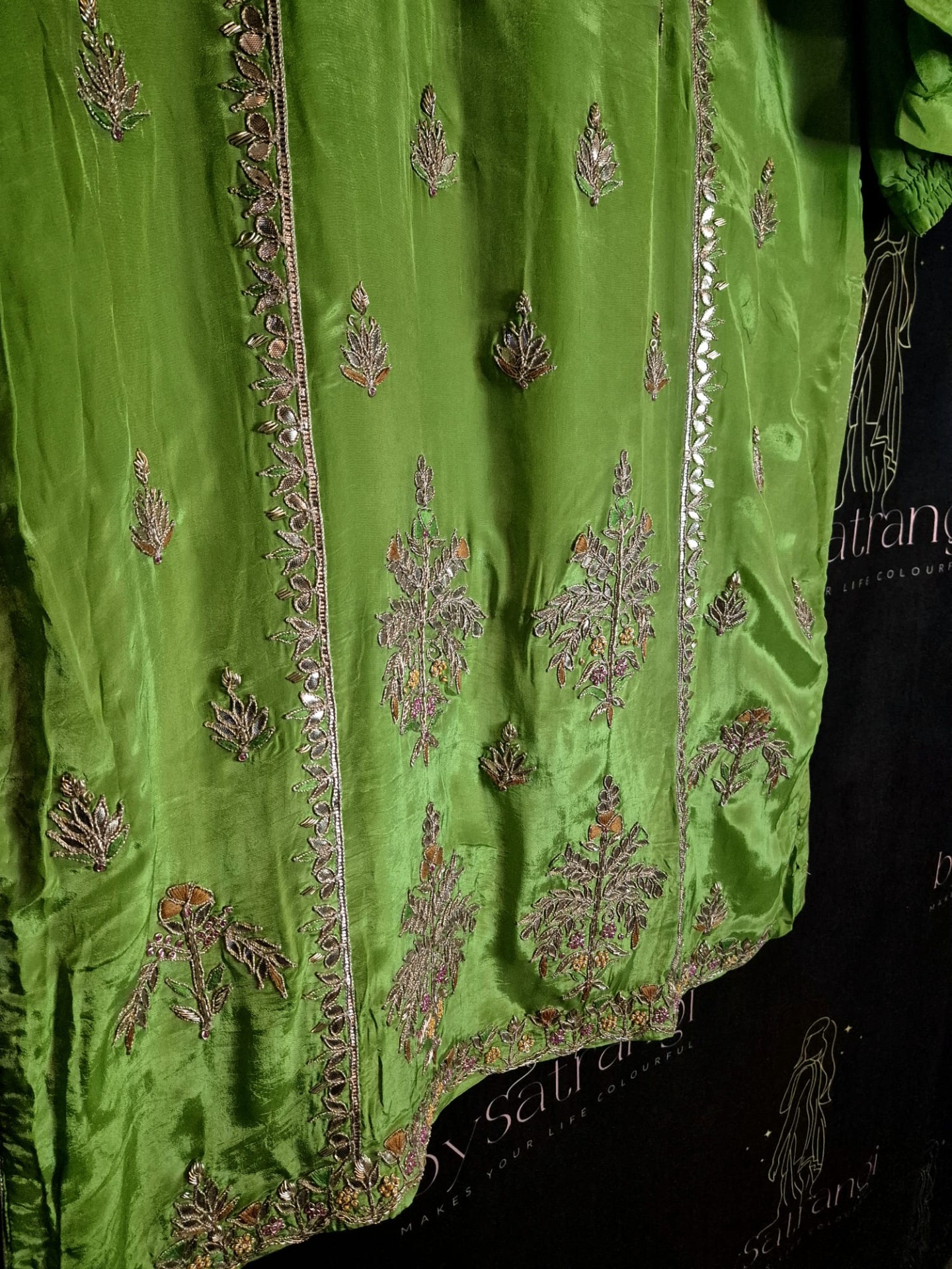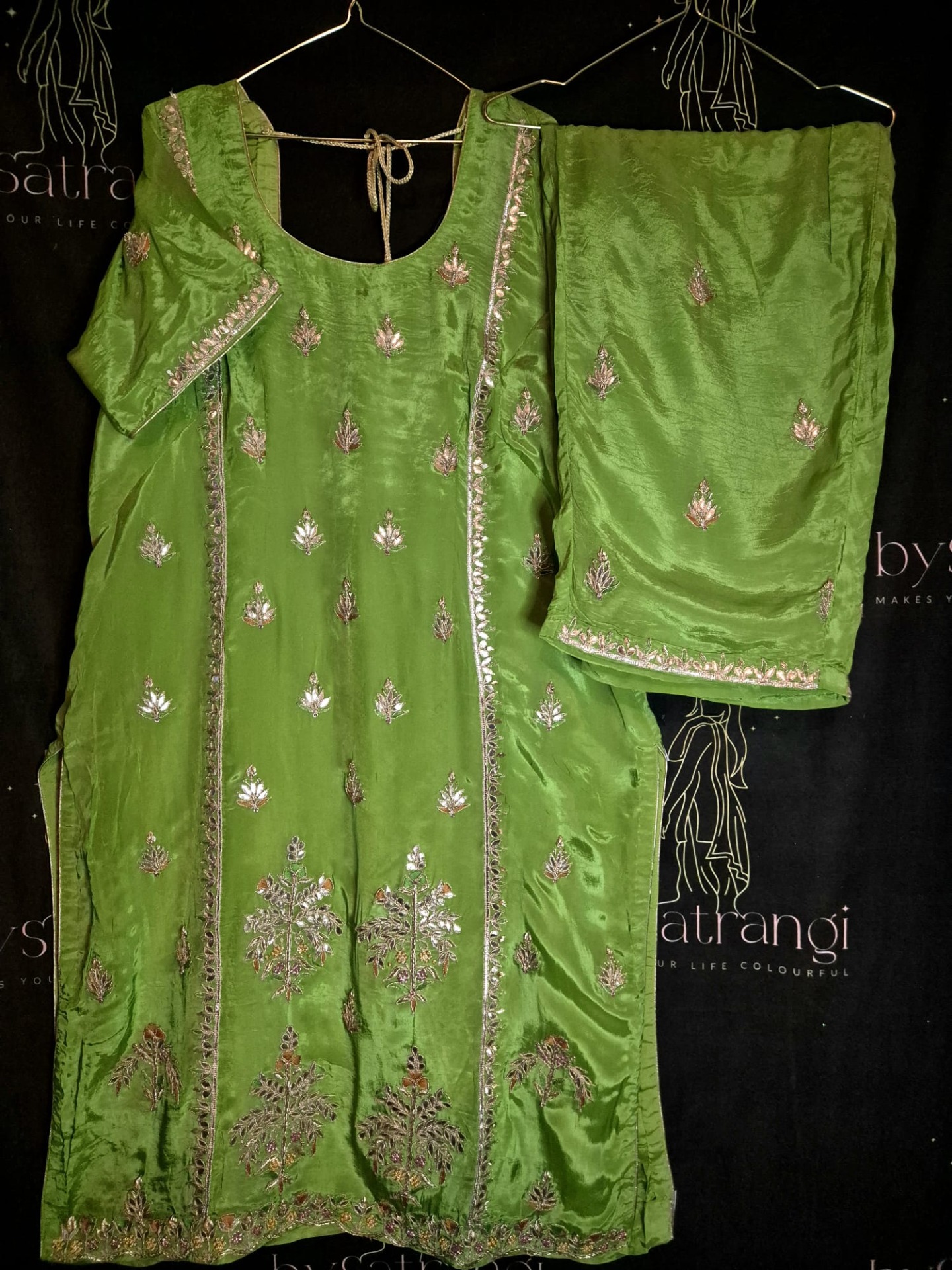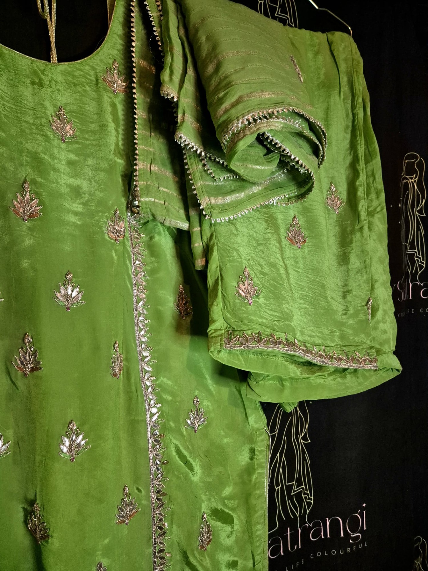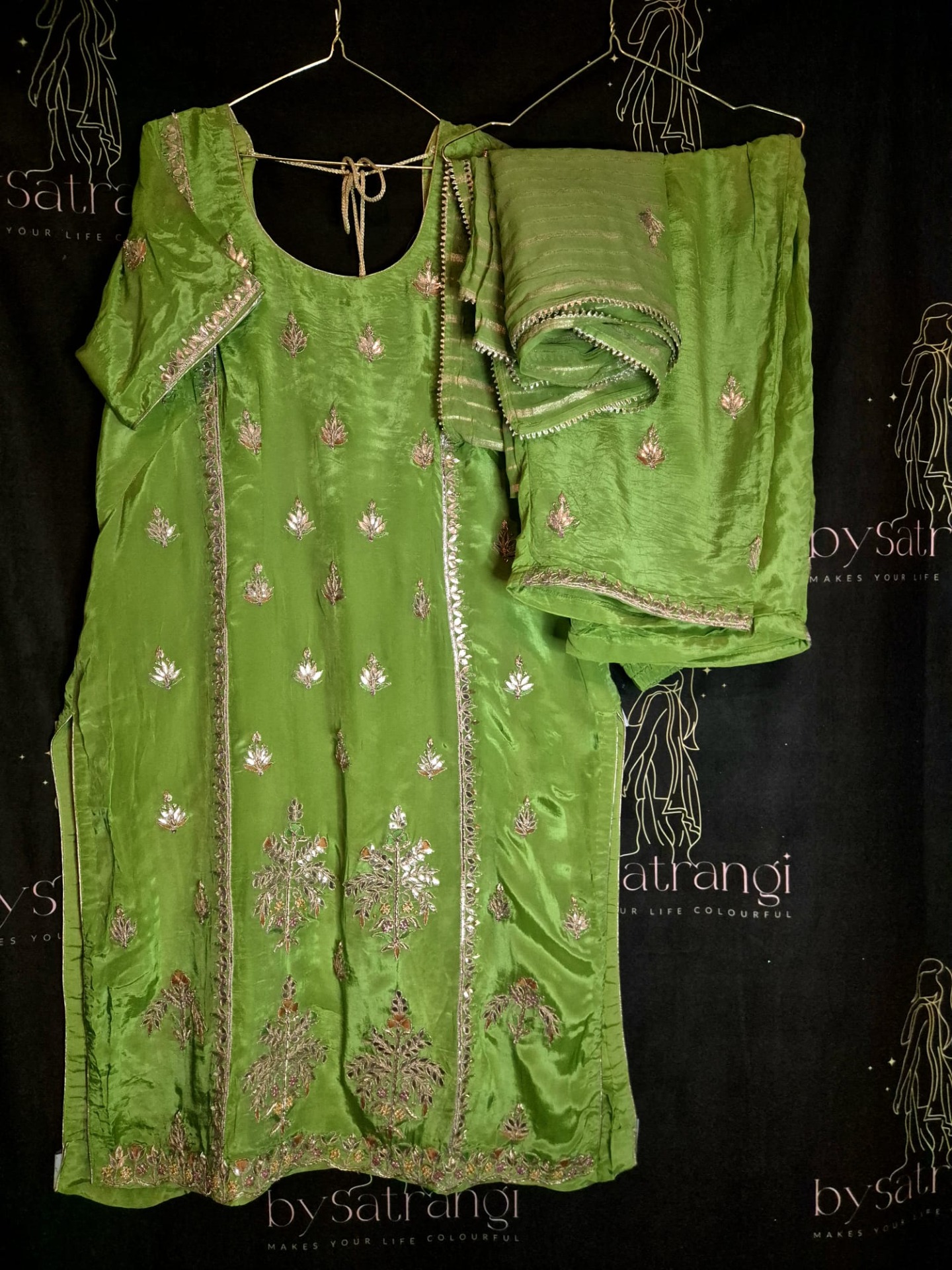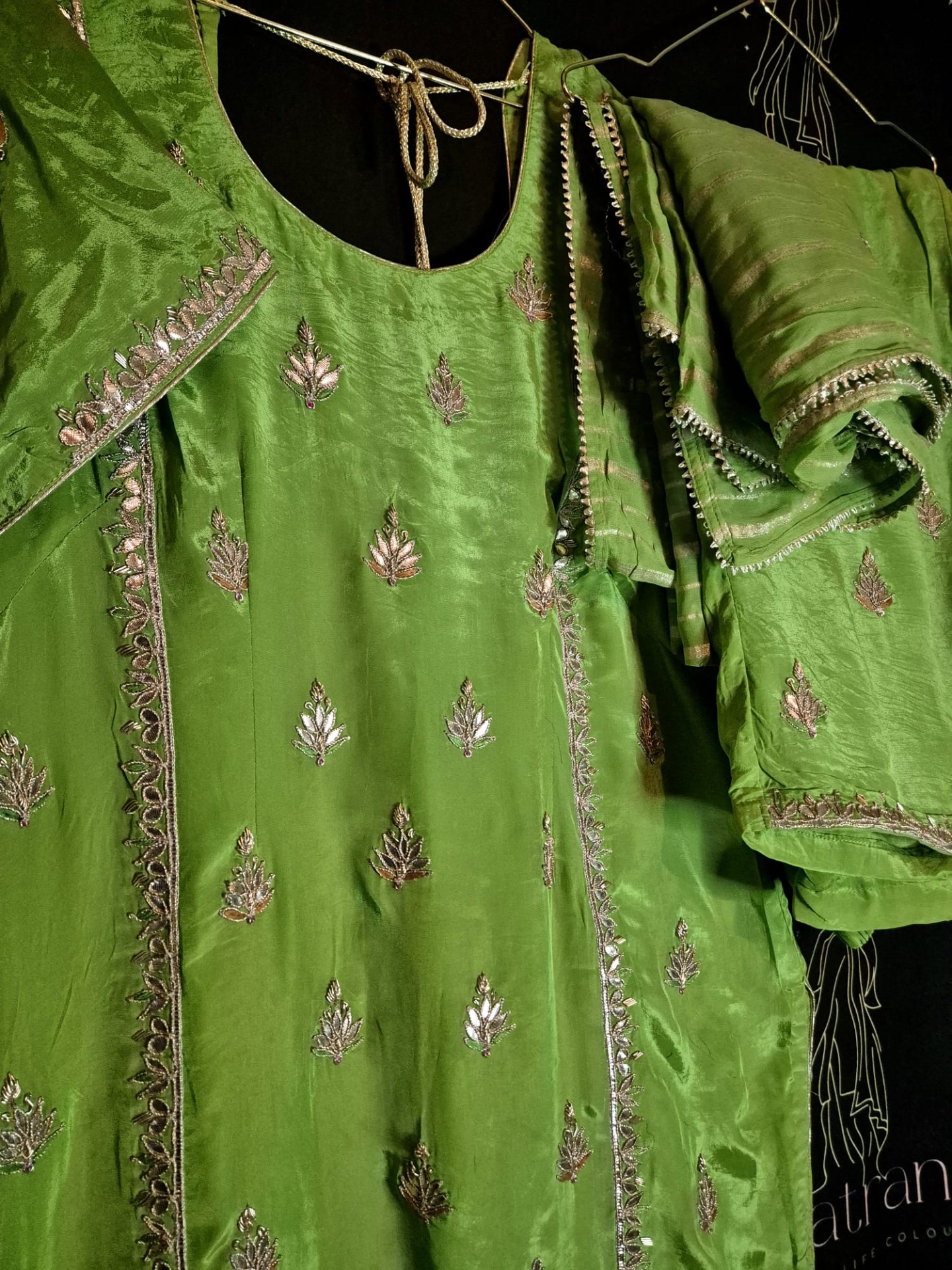 Bewerkingen: De top is versierd met goudkleurig draadborduurwerk in blad- en bloemmotieven, gelijkmatig verdeeld. Langs de halslijn, mouwen en zijkanten is een elegante geborduurde rand aangebracht. De dupatta is afgewerkt met fijne borduurranden en subtiele motieven.