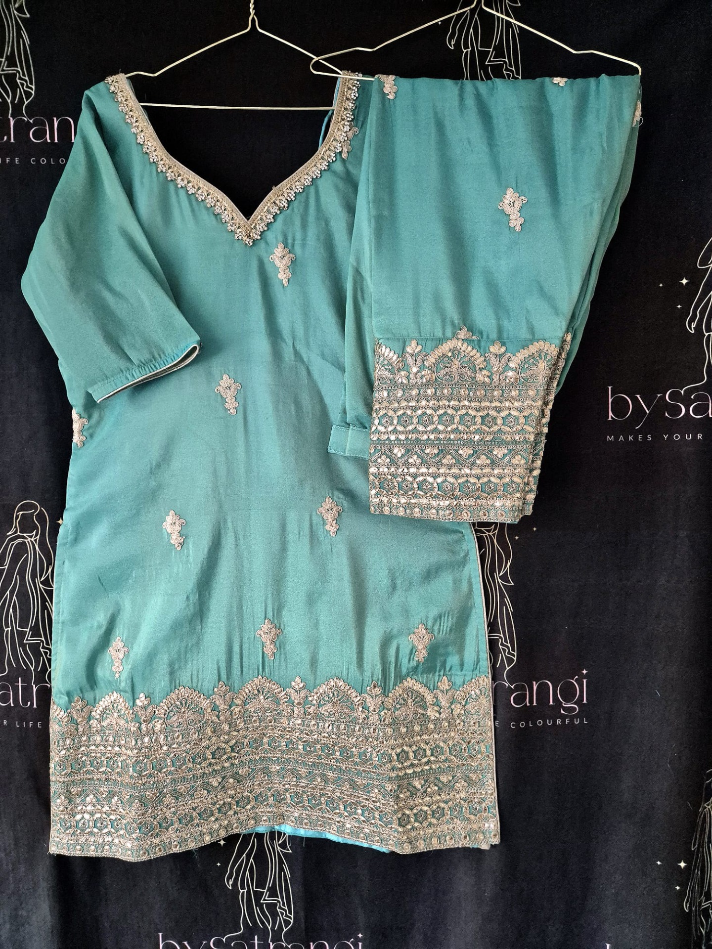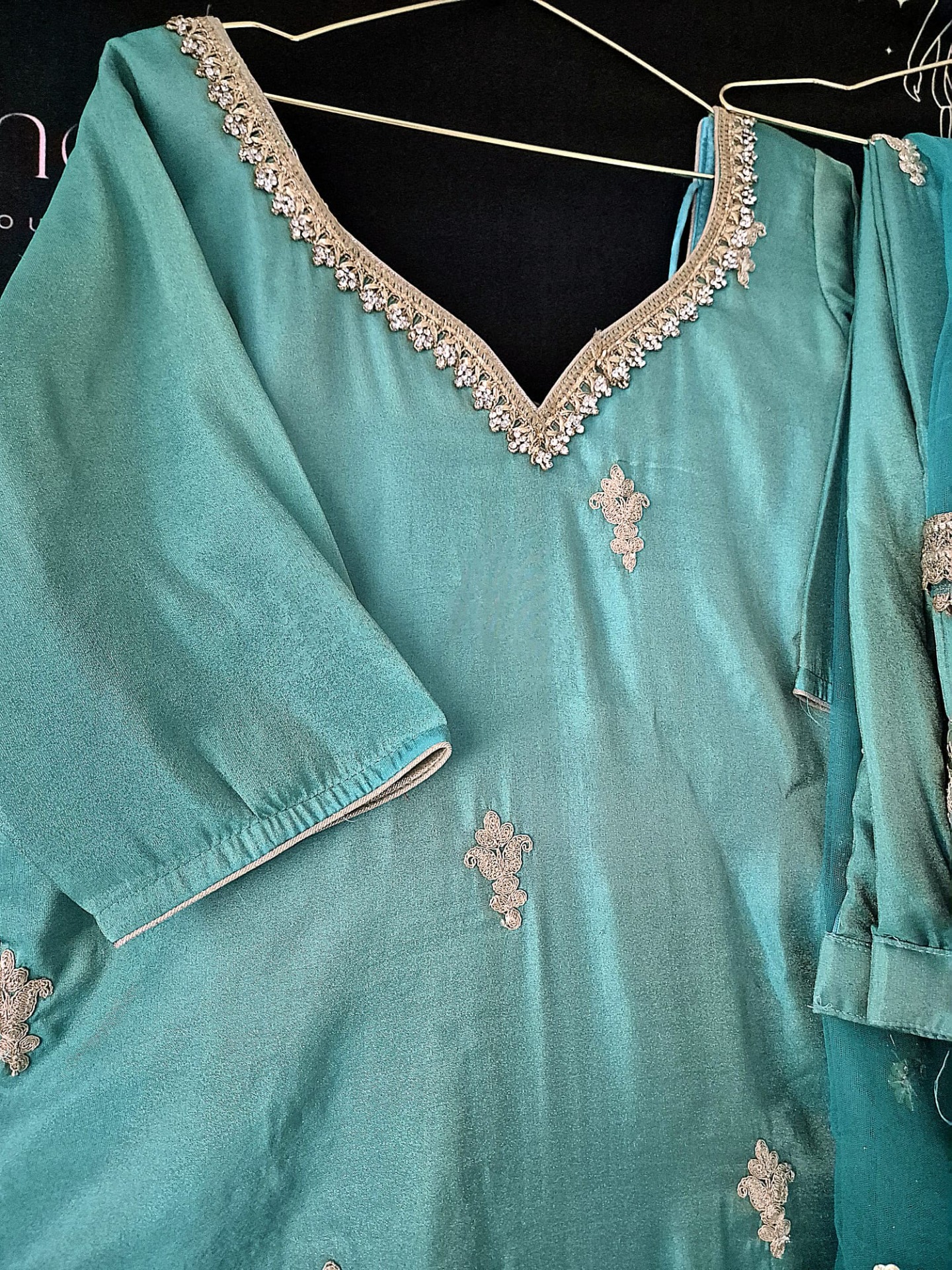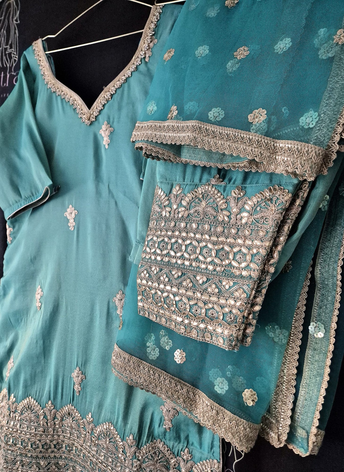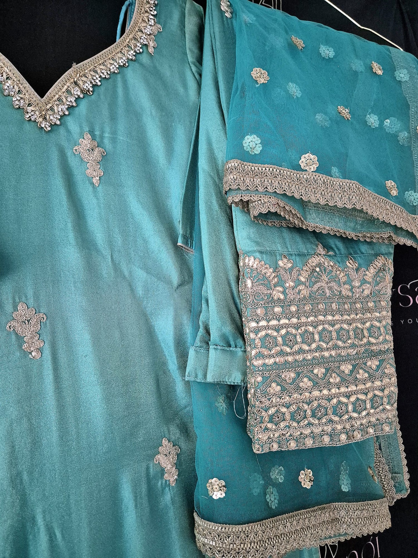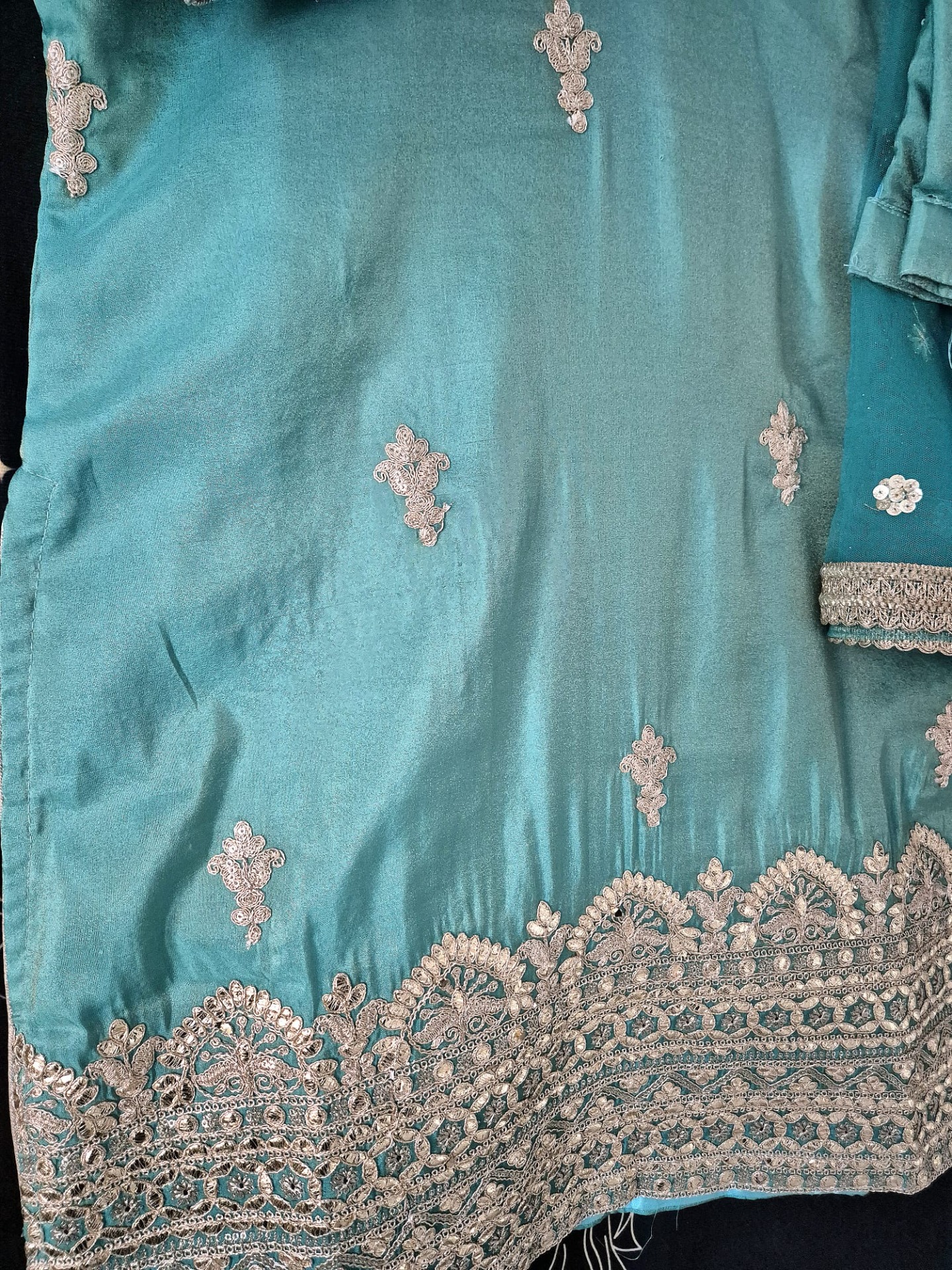 Embroidery: The top features silver embroidery along the neckline and hem, complemented by delicate embroidered motifs all-over. The pants are detailed with intricate embroidery matching with the top. The dupatta is finished with small floral motifs and an elegant lace border.
