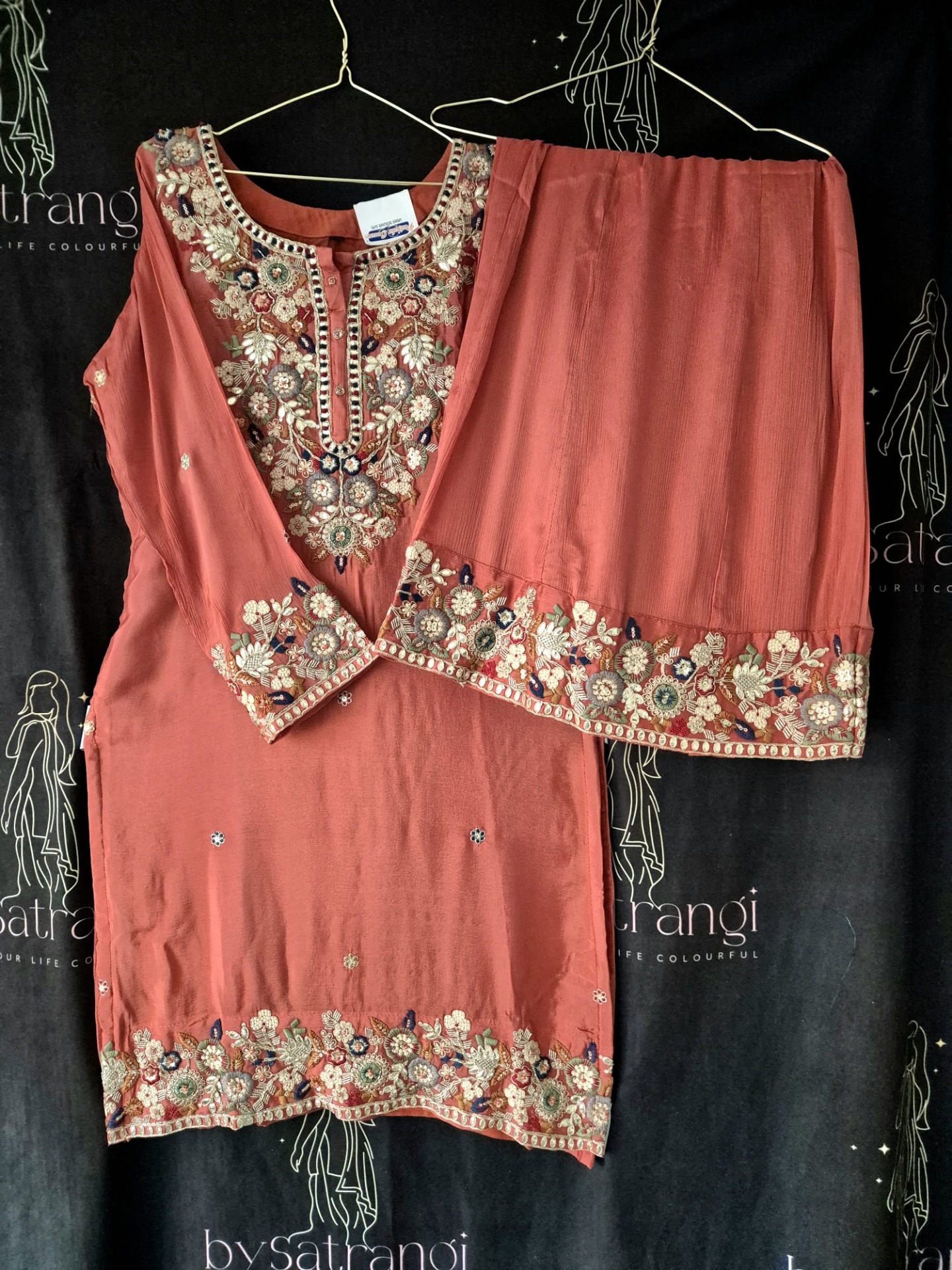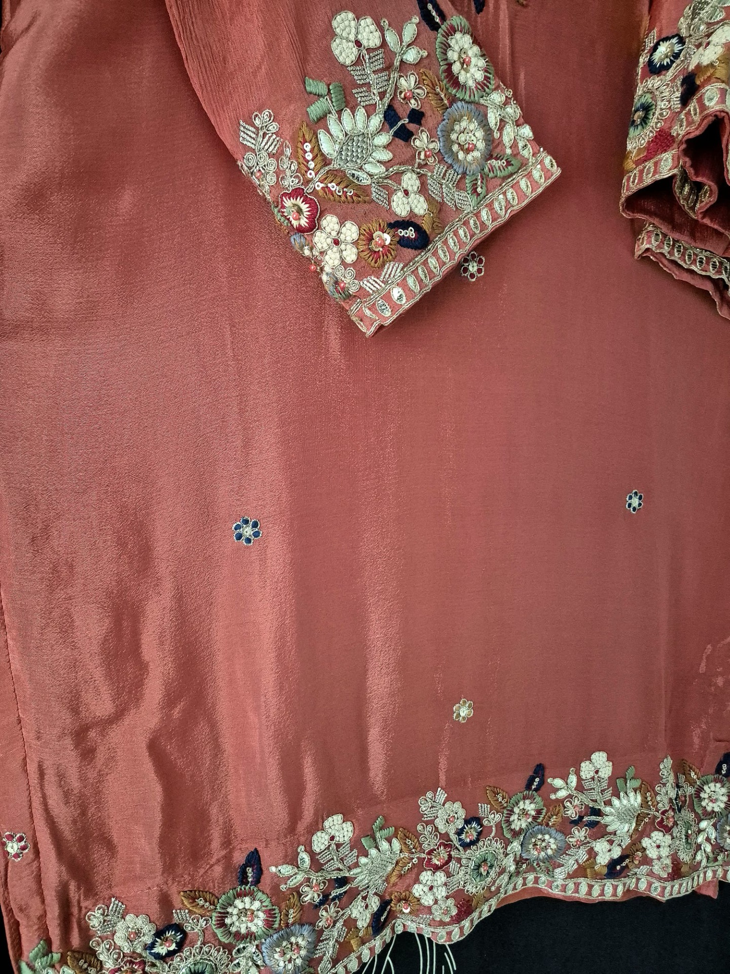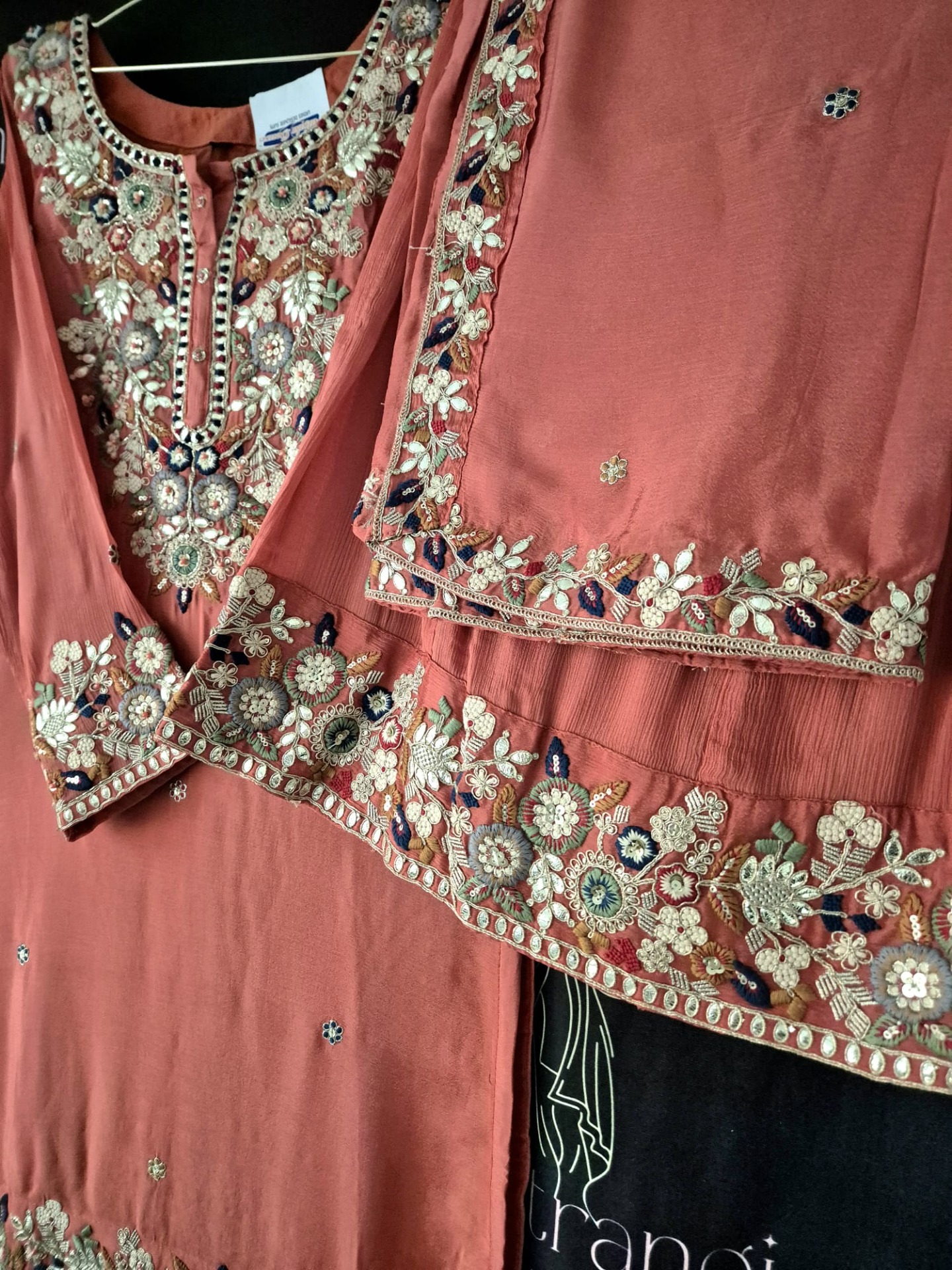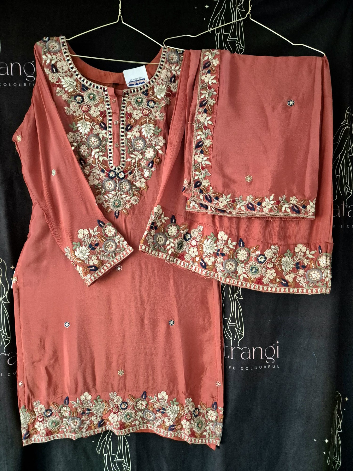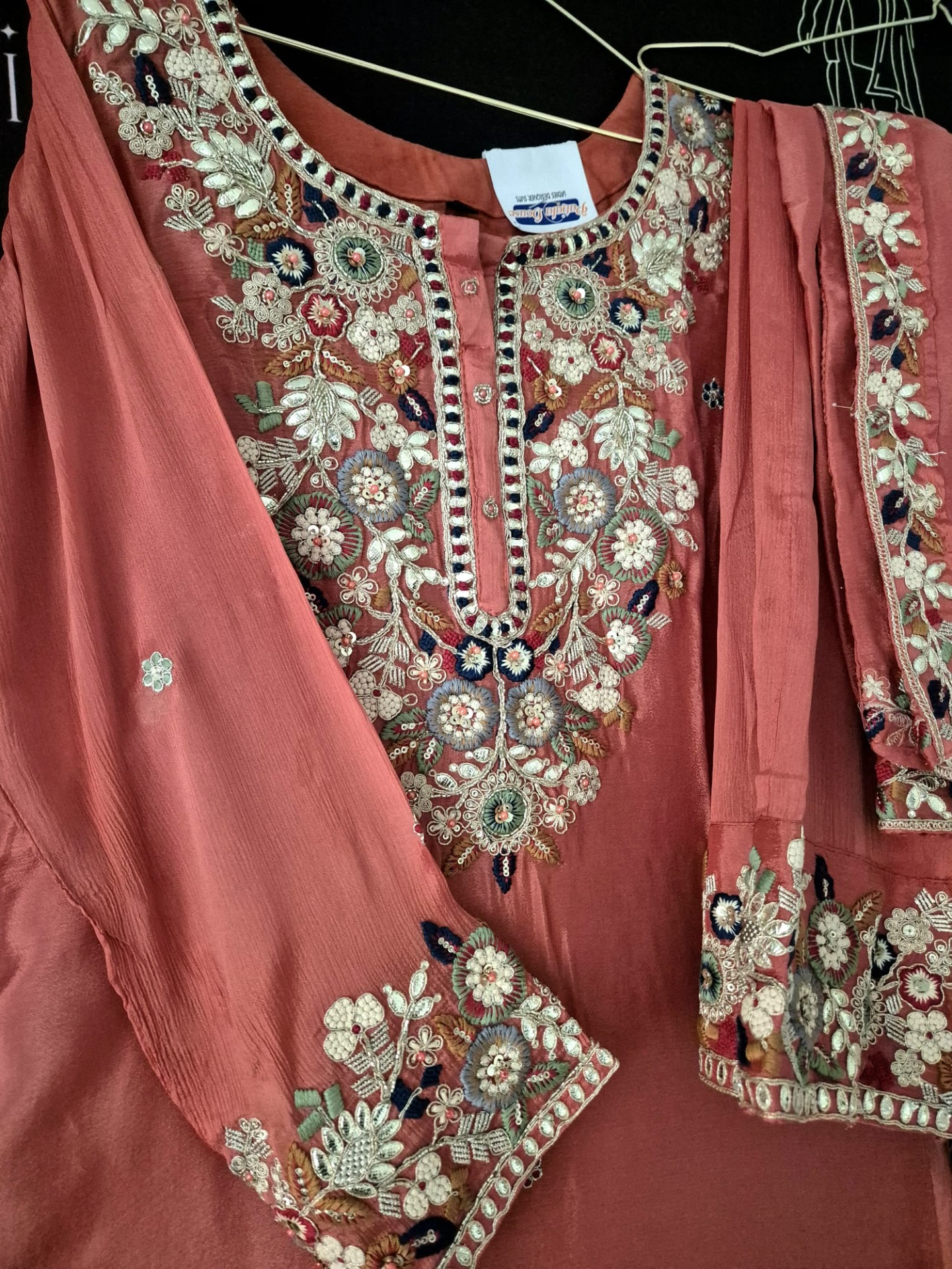 Bewerkingen: De top is rijk versierd met verfijnd multikleur borduurwerk rond de halslijn, mouwen en zoom, gecombineerd met subtiele spiegel- en kralendetails. Kleine geborduurde motieven zijn verspreid over de gehele top. De dupatta is afgewerkt met een bijpassende geborduurde rand en fijne details.