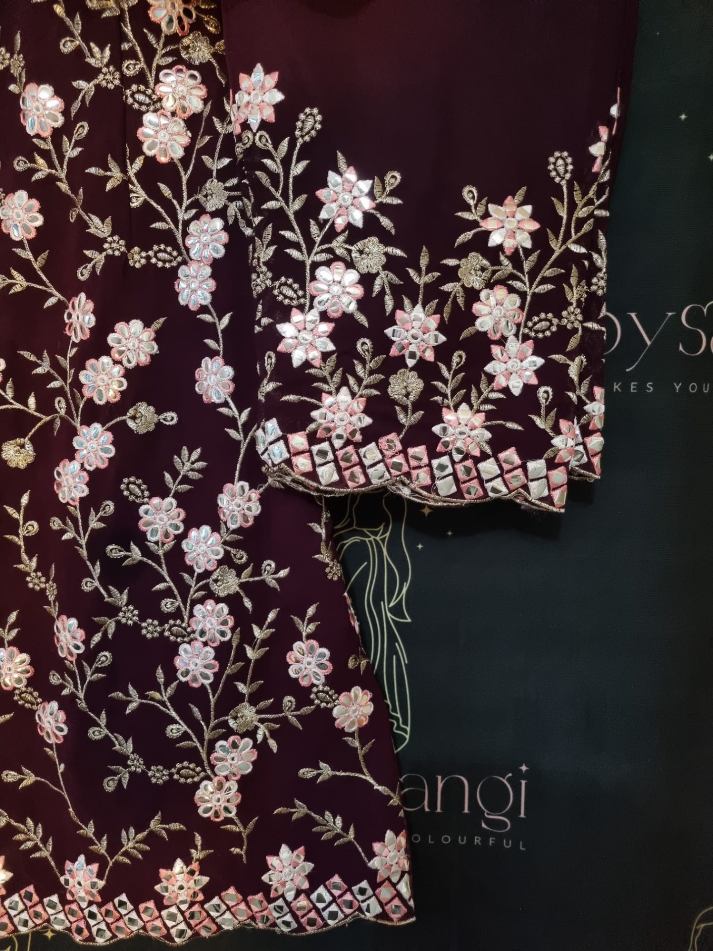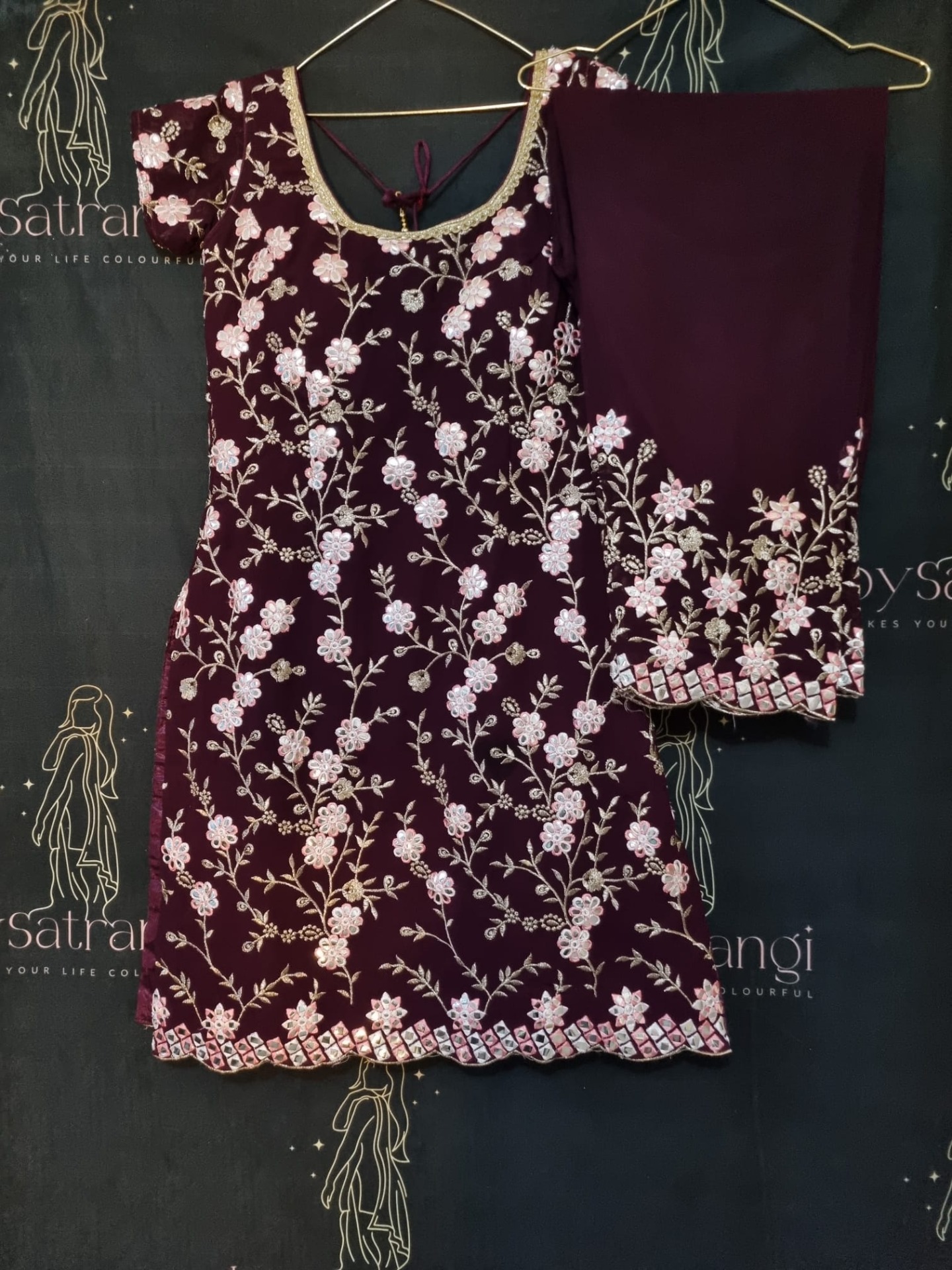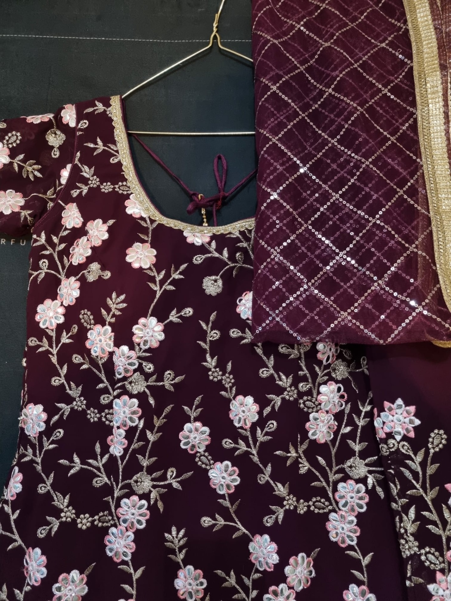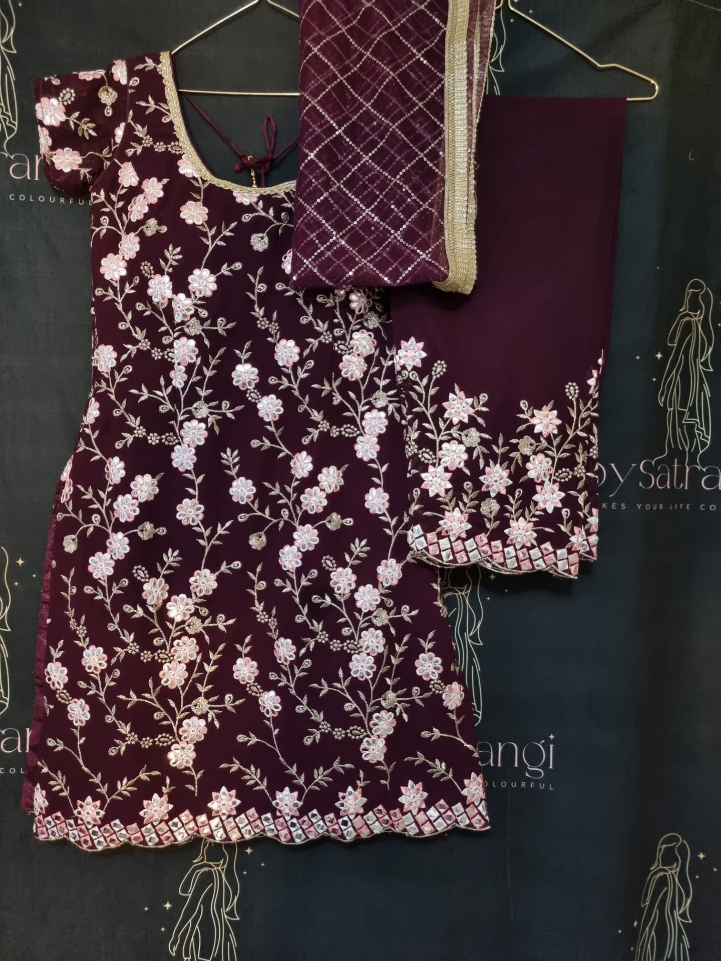 Bewerkingen: De top is versierd met verfijnd bloemrijk borduurwerk in zachte roze en goudtinten. De halslijn en zoom zijn afgewerkt met een subtiele goudkleurige rand en decoratieve details. De dupatta bevat een elegant ruitpatroon en een fijne goudkleurige afwerking.