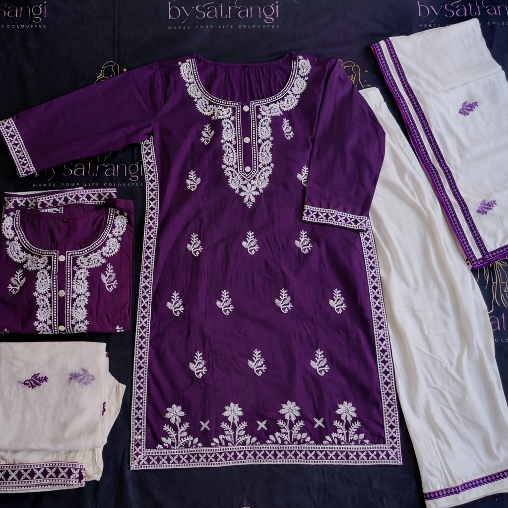 Embroidery: The top is richly detailed along the neckline, sleeves, and hem with white floral motifs. The dupatta is finished with a purple border and matching purple embroidery.