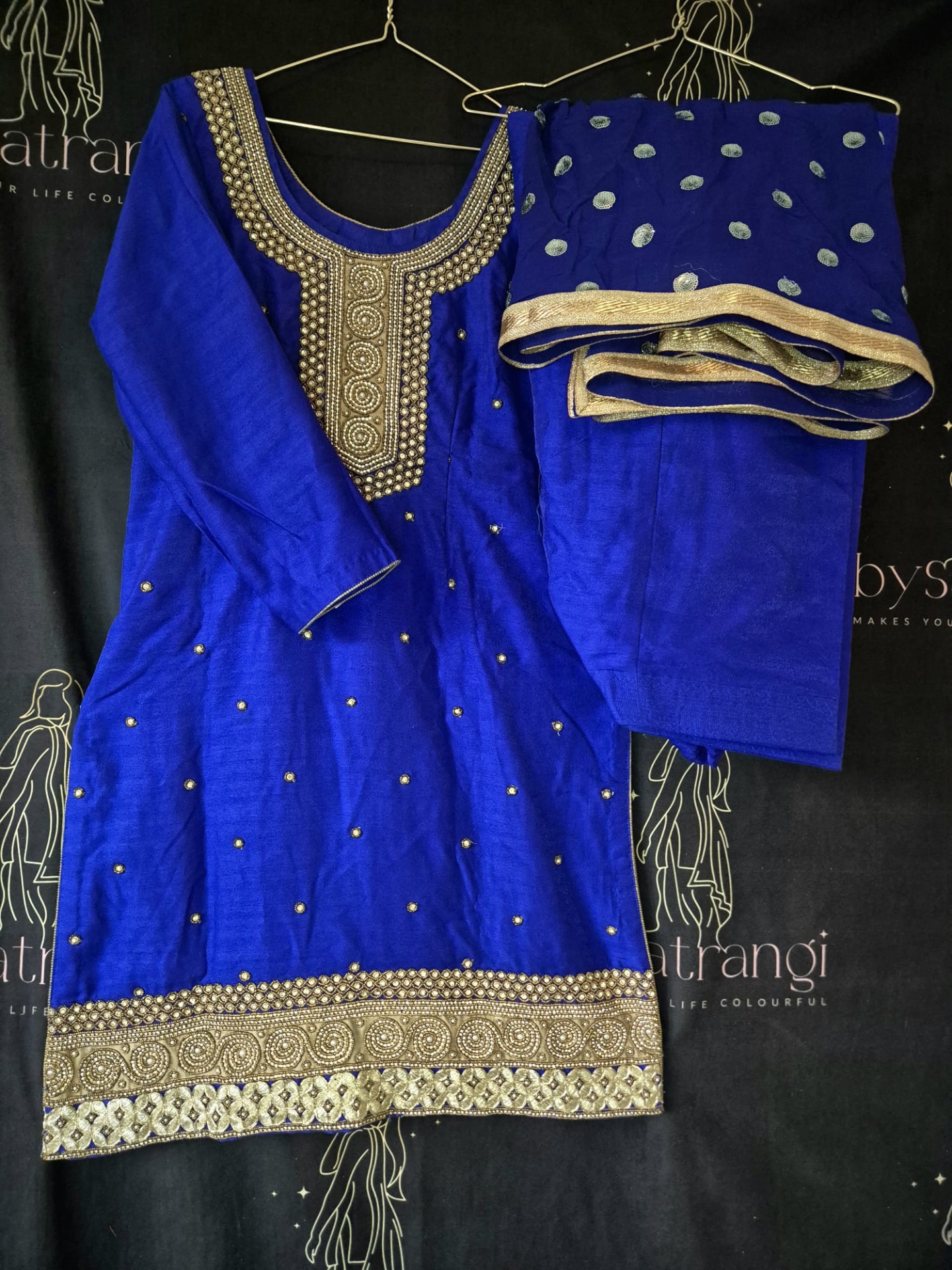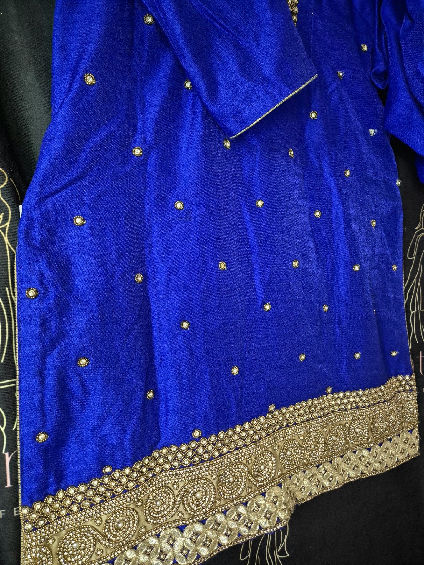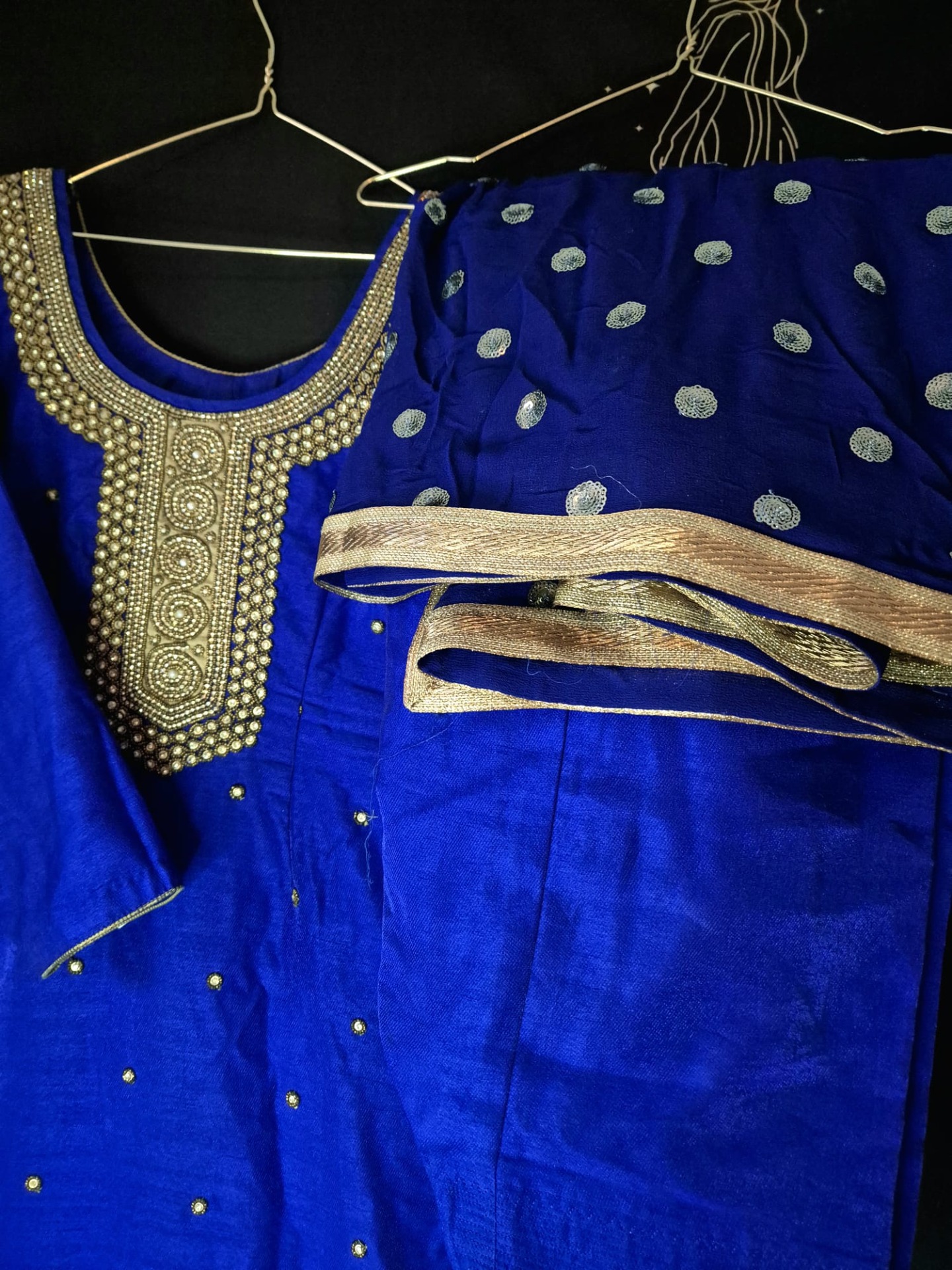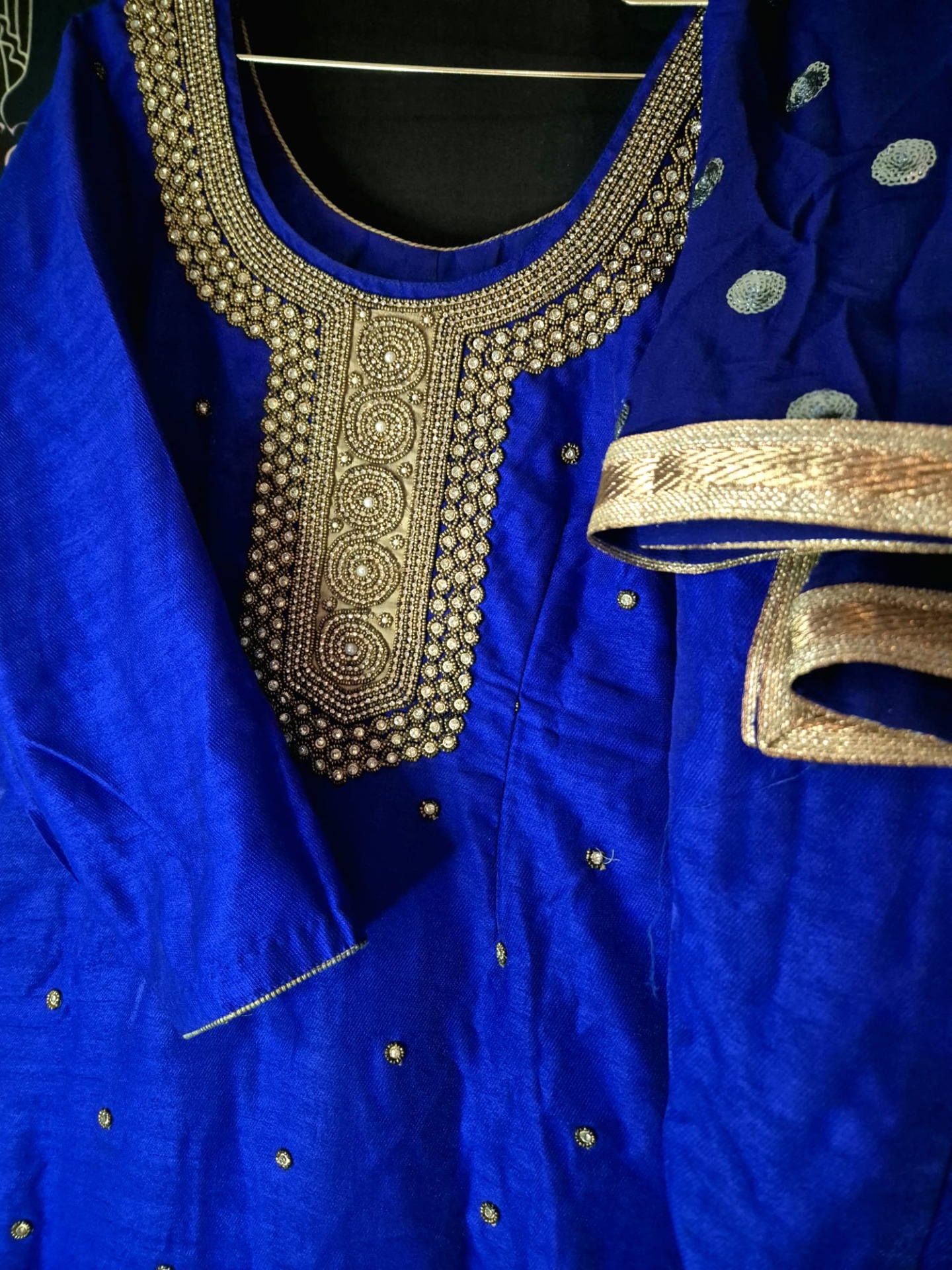 Embroidery: Rich gold-toned embroidery around the neckline and hem, featuring circular and textured motifs. Delicate gold embellishments scattered across the top. The dupatta is finished with an elegant gold border.