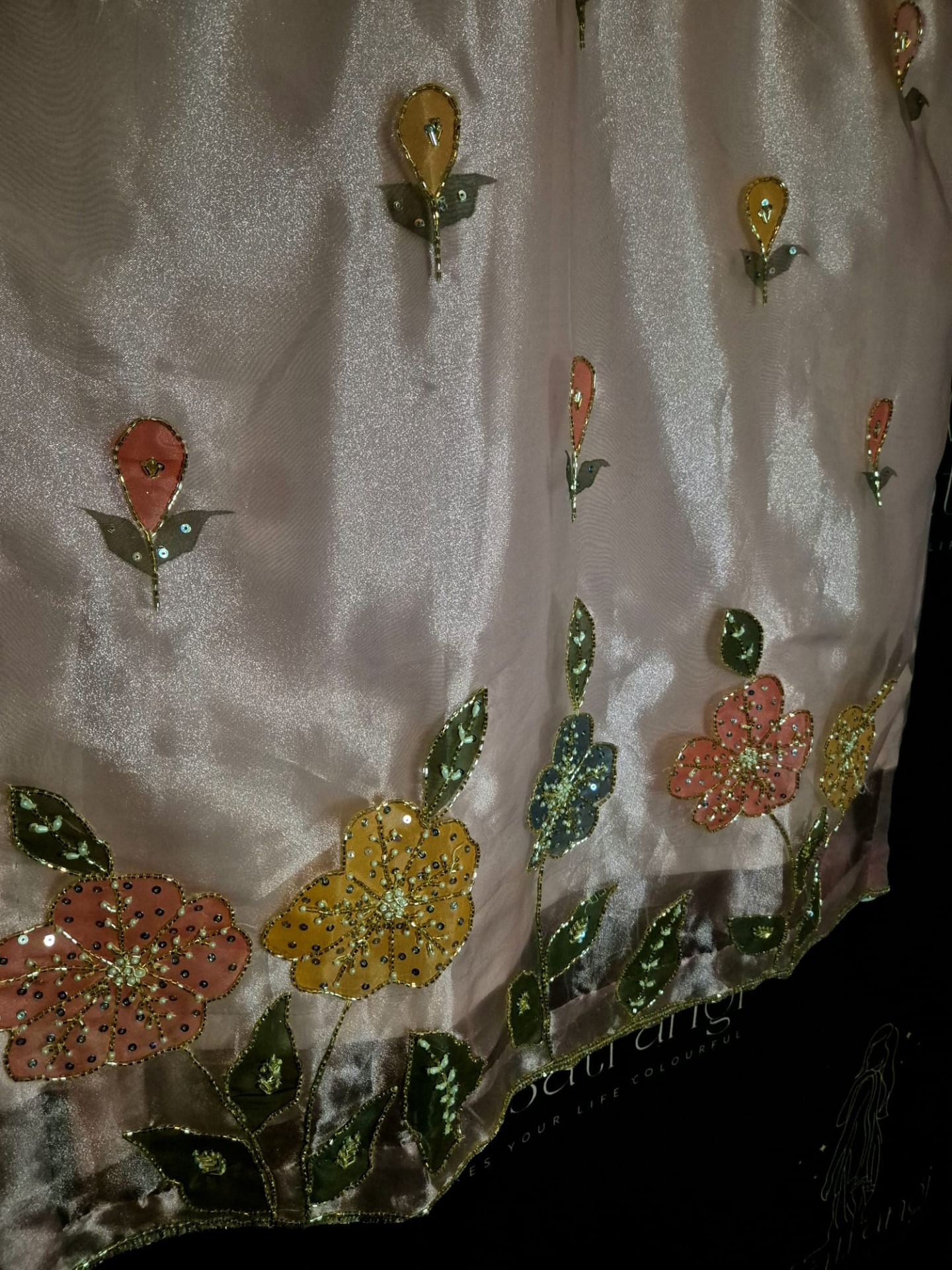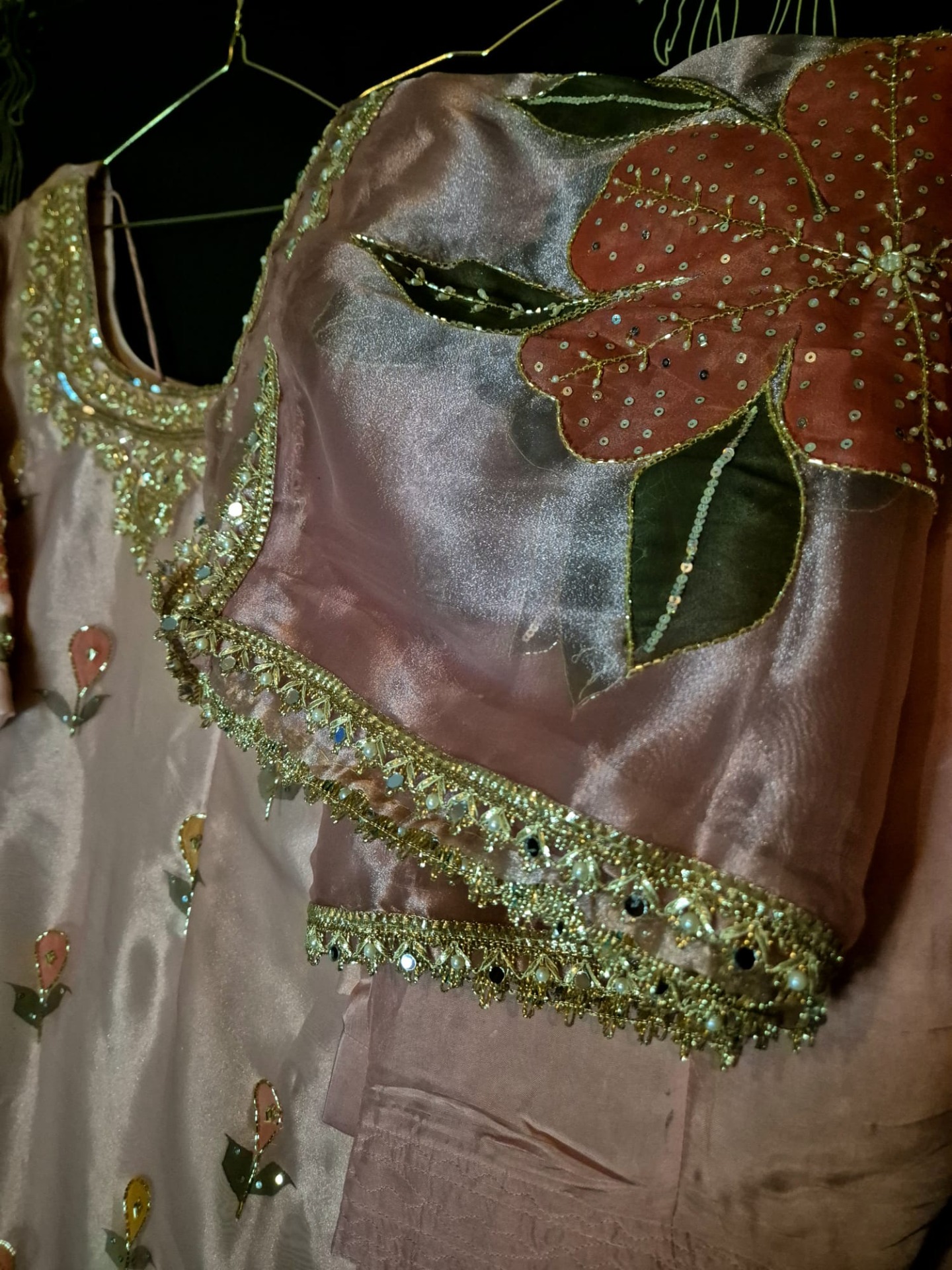 Embroidery: Delicate gold-toned embroidery along the neckline featuring beads and sequins. The kameez is adorned with subtle floral motifs and a richly embellished floral hem. The dupatta is finished with a decorative gold border and printed floral accents.