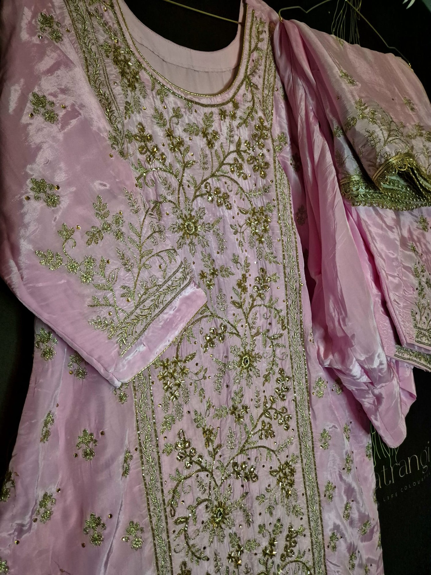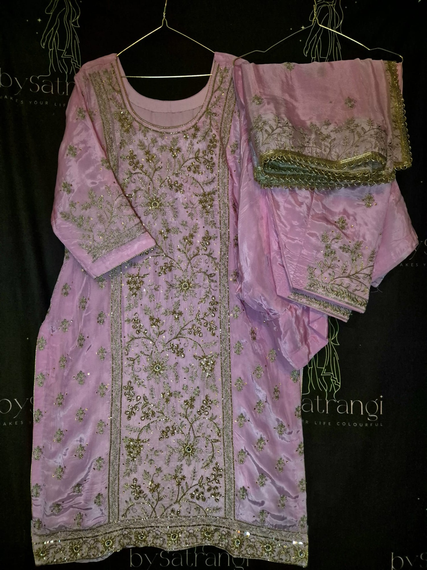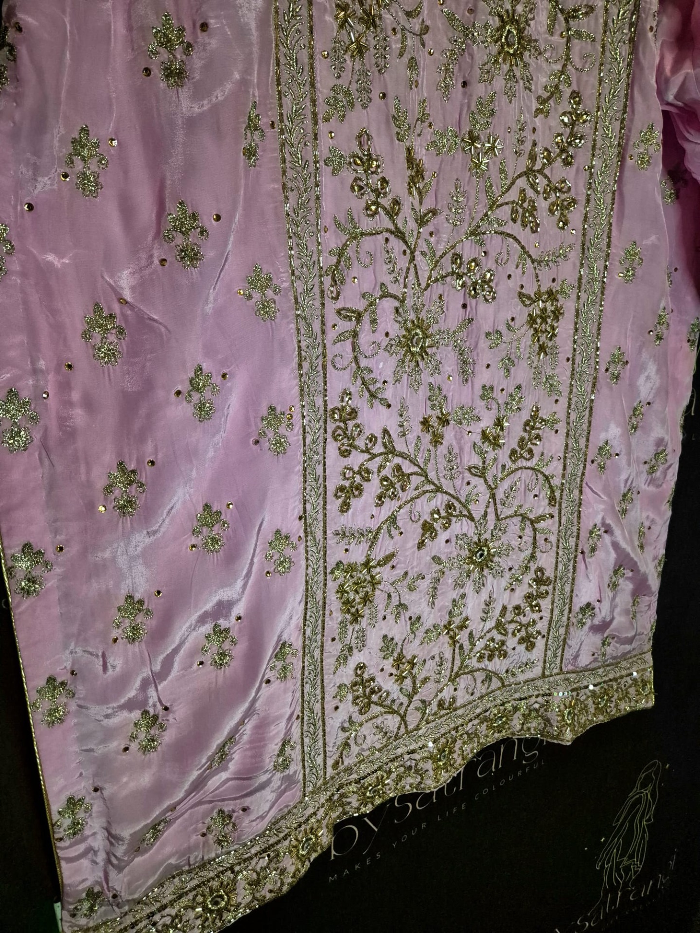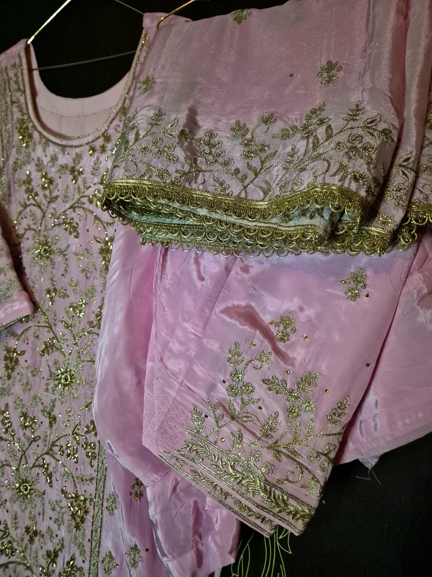 Embroidery: Extensive gold-toned embroidery featuring floral and vine motifs across the kameez, enhanced with beads and sequins. The front is detailed with a richly embroidered panel and an ornate hemline. The same embroidery is included on the salwar as well. The dupatta is finished with a decorative gold border and delicate embroidery.