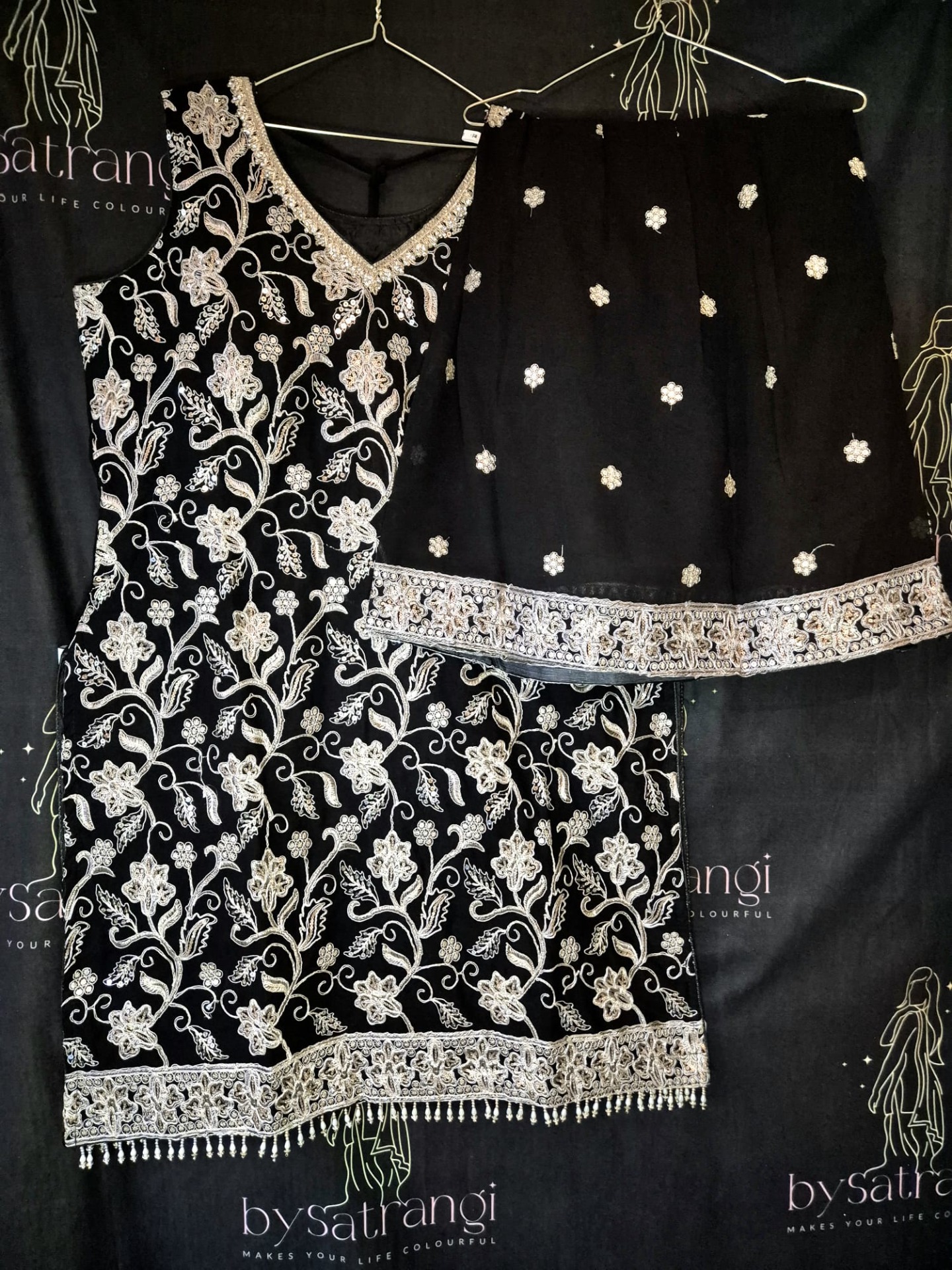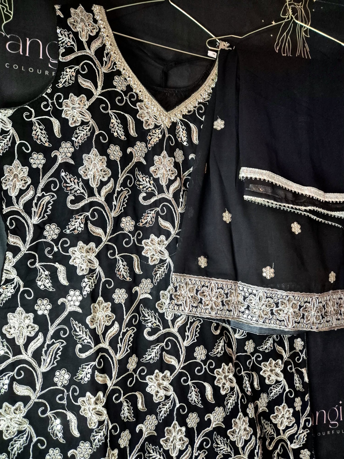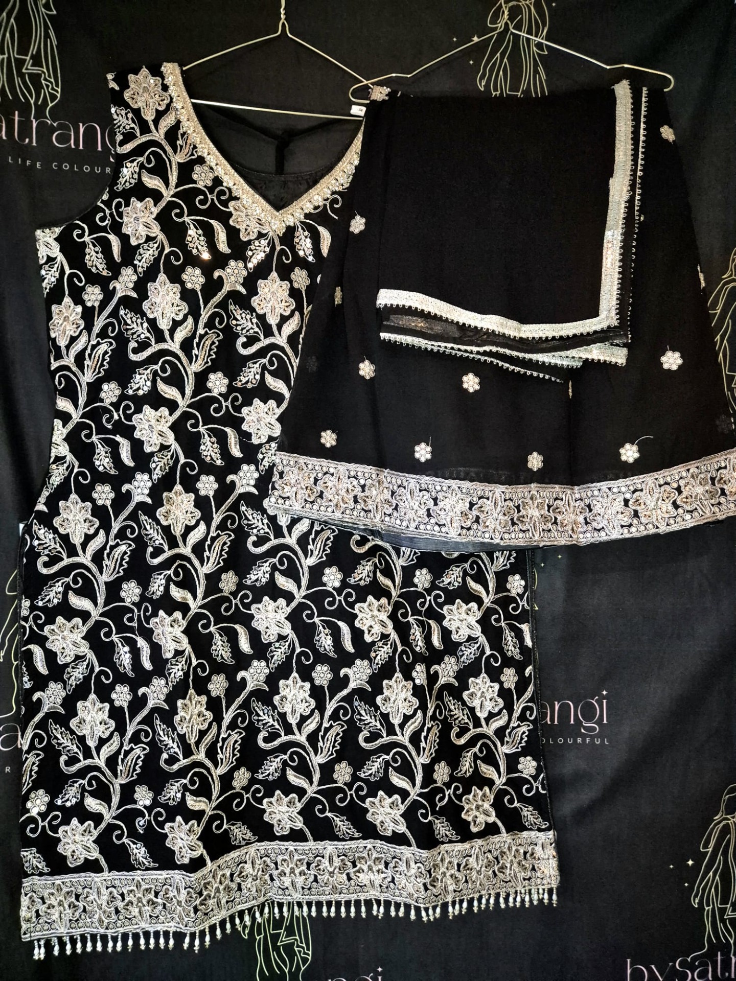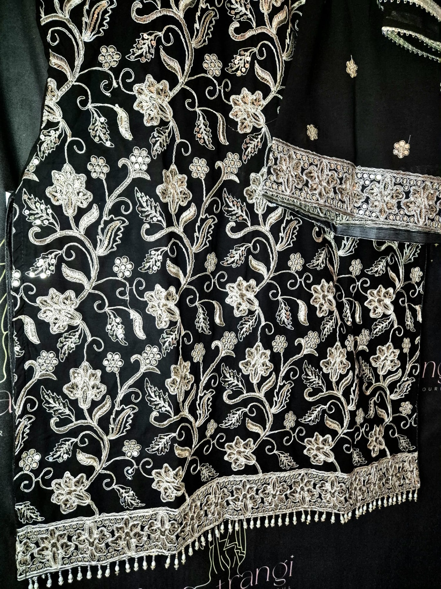 Embroidery: The top is richly adorned with intricate silver-toned embroidery featuring floral and vine motifs throughout. The neckline is elegantly detailed with fine embroidery, while the hem is finished with a wide, ornate embroidered border and delicate hanging accents for a luxurious look. The pants feature subtle silver embroidery details that complement the overall design. The dupatta is enhanced with a refined silver border.