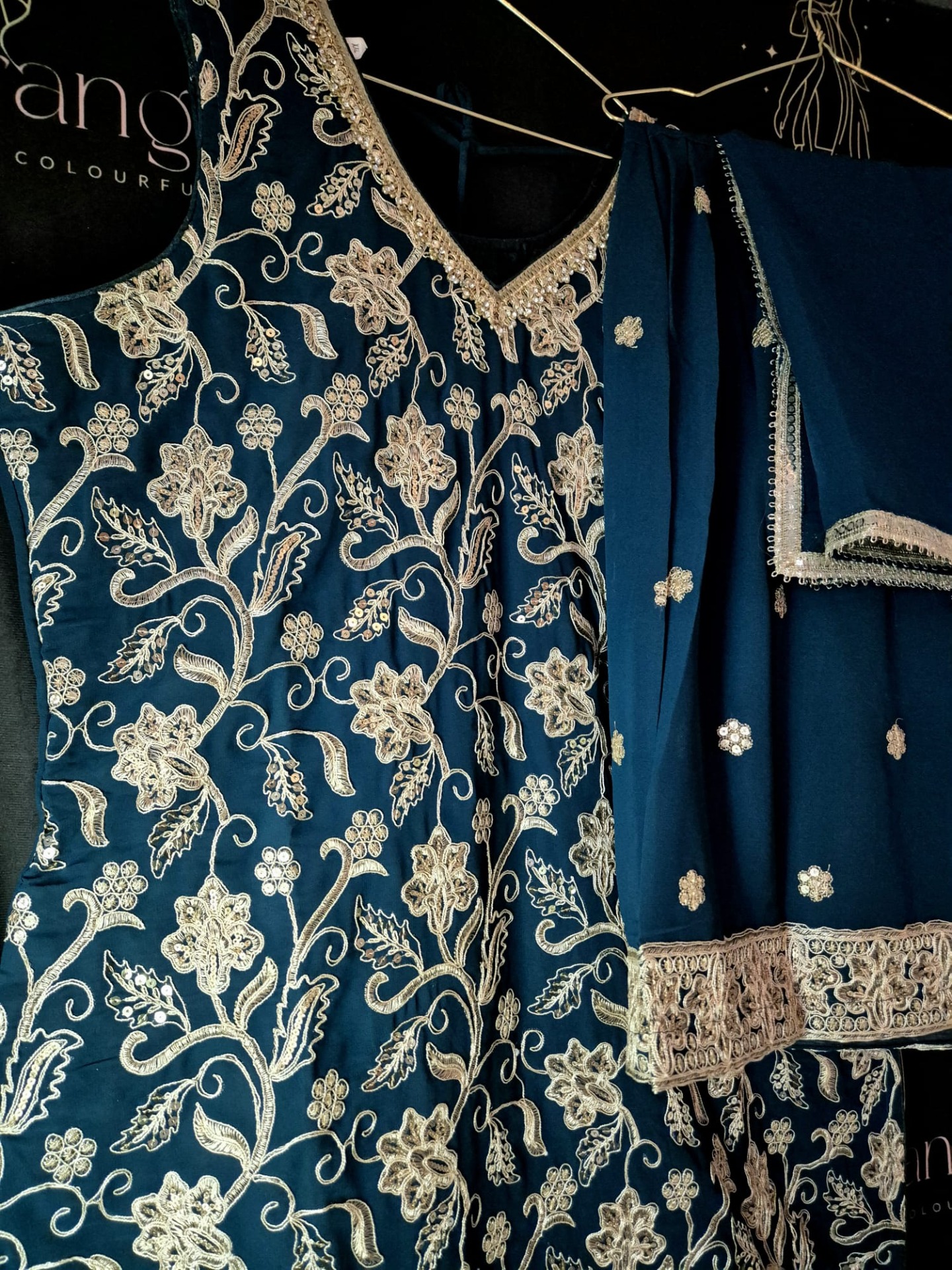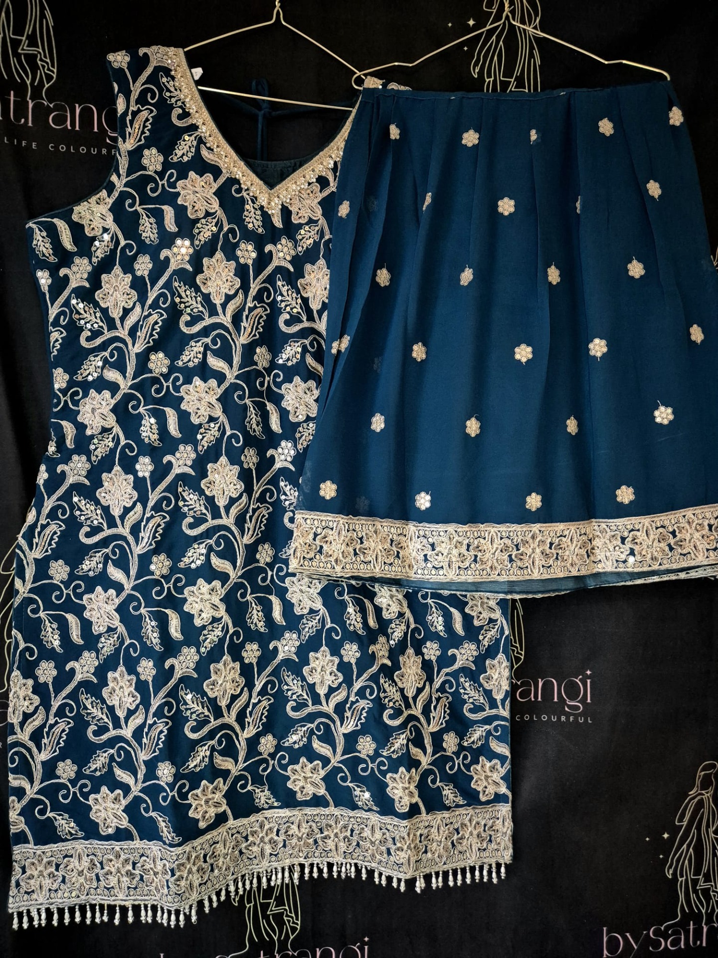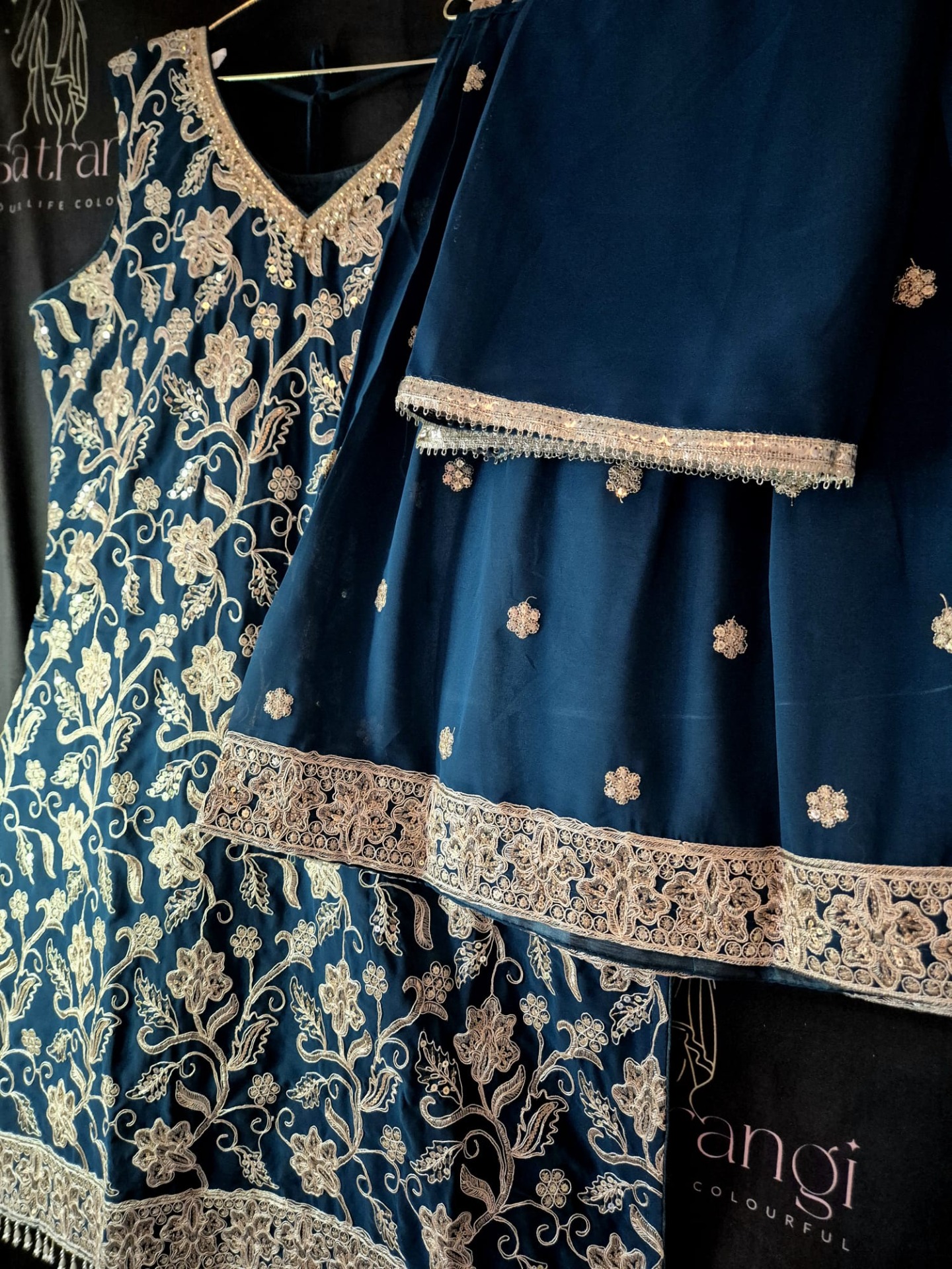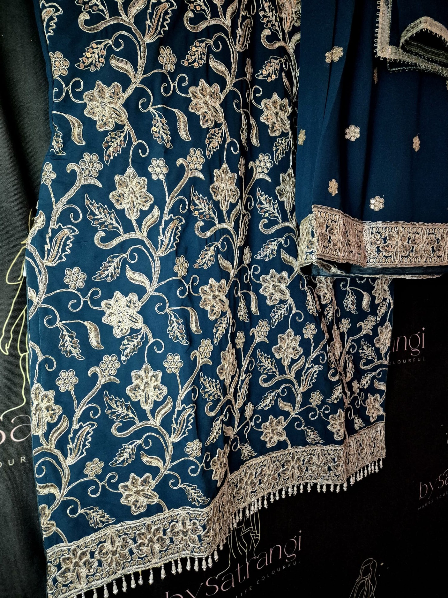Embroidery: The top is richly adorned with intricate silver-toned embroidery featuring floral and vine motifs throughout. The neckline is elegantly detailed with fine embroidery, while the hem is finished with a wide, ornate embroidered border and delicate hanging accents for a luxurious look. The pants feature subtle silver embroidery details that complement the overall design. The dupatta is enhanced with a refined silver border.