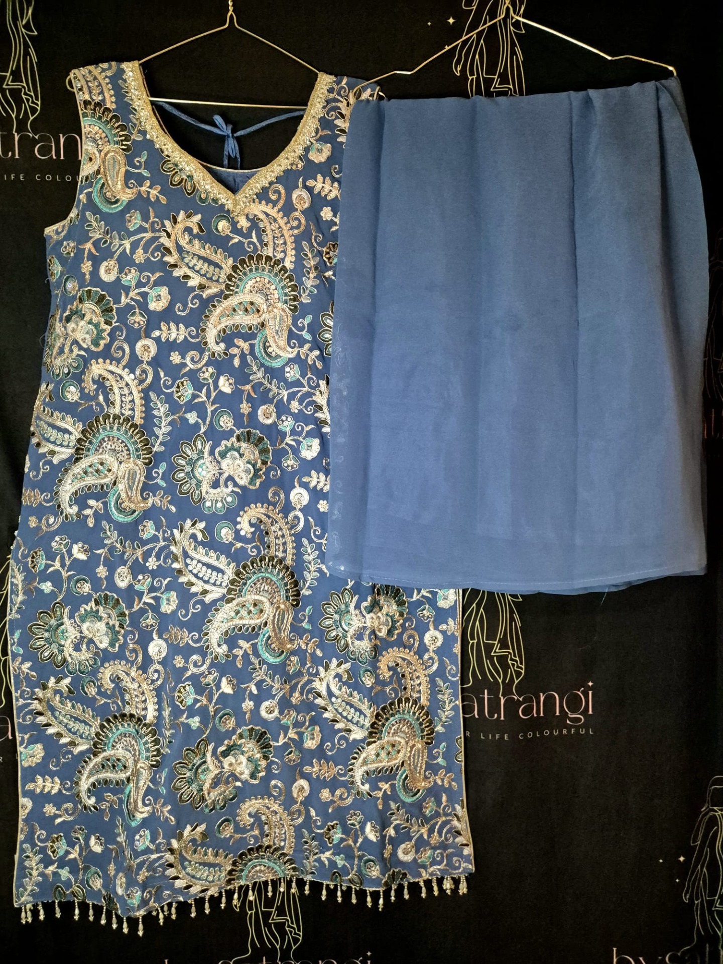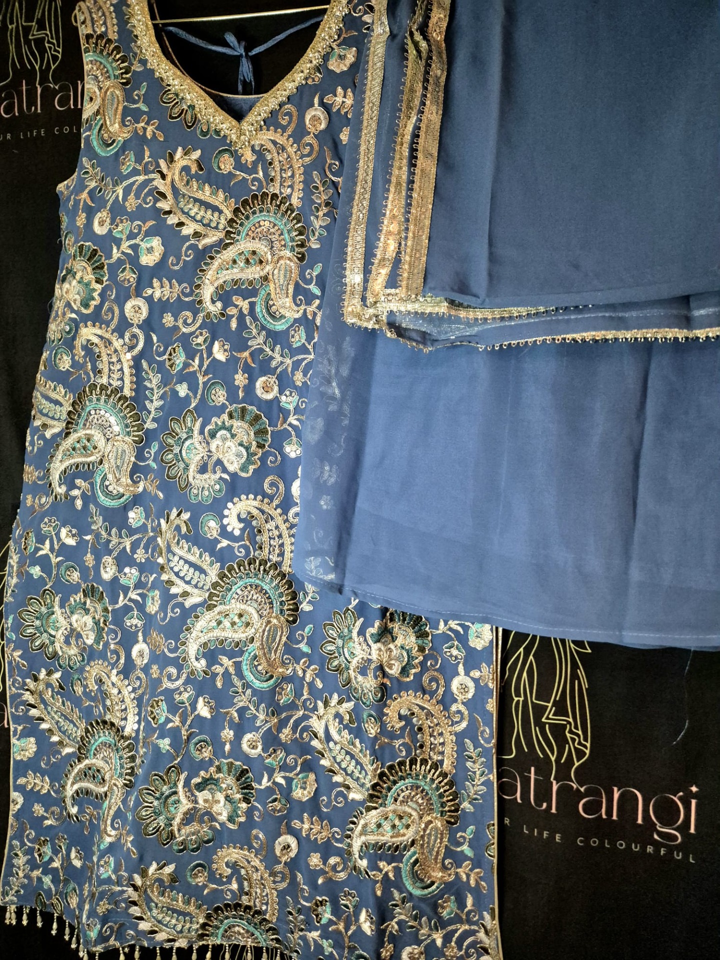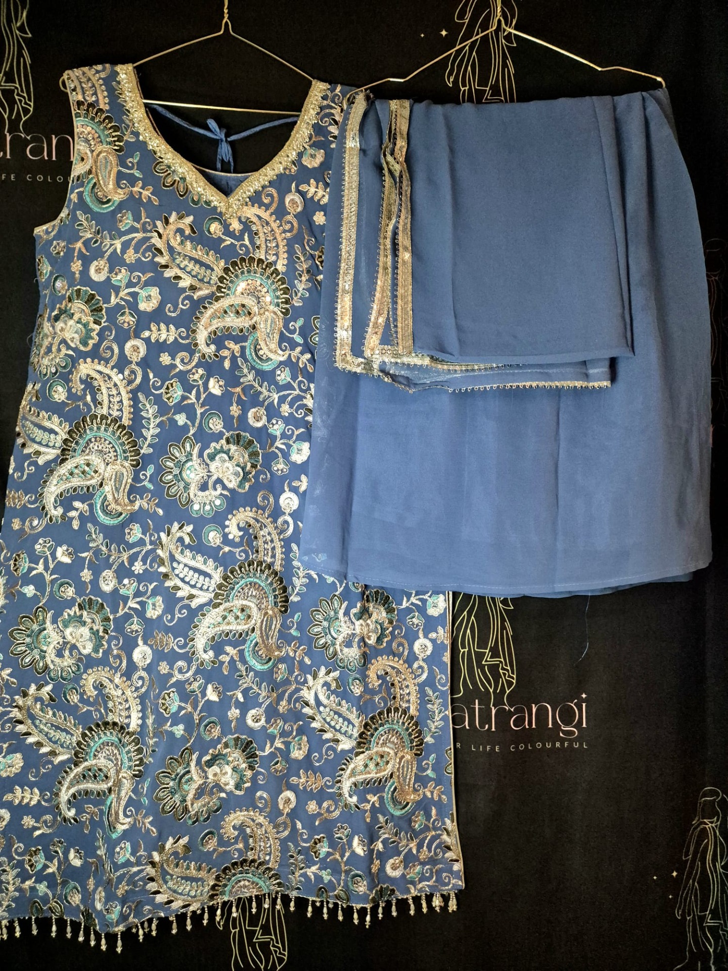 Embroidery: The top is richly adorned with intricate embroidery featuring paisley and floral motifs in turquoise, silver, and soft pastel tones. The neckline is elegantly finished with silver embroidery and subtle shimmer details. The hemline is enhanced with delicate hanging embellishments. The dupatta is finished with a subtle silver border.