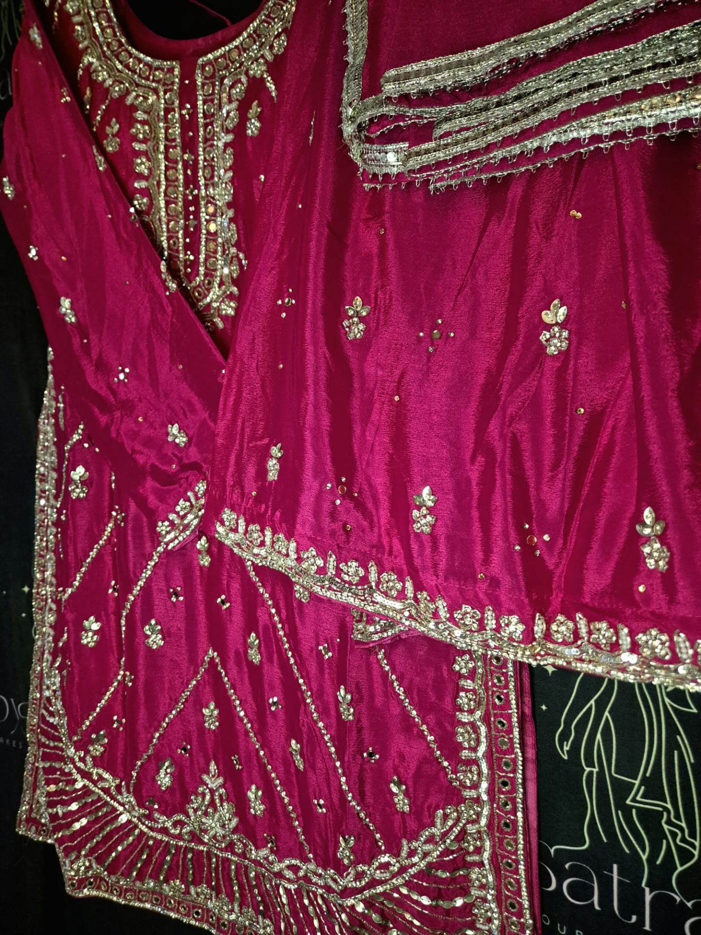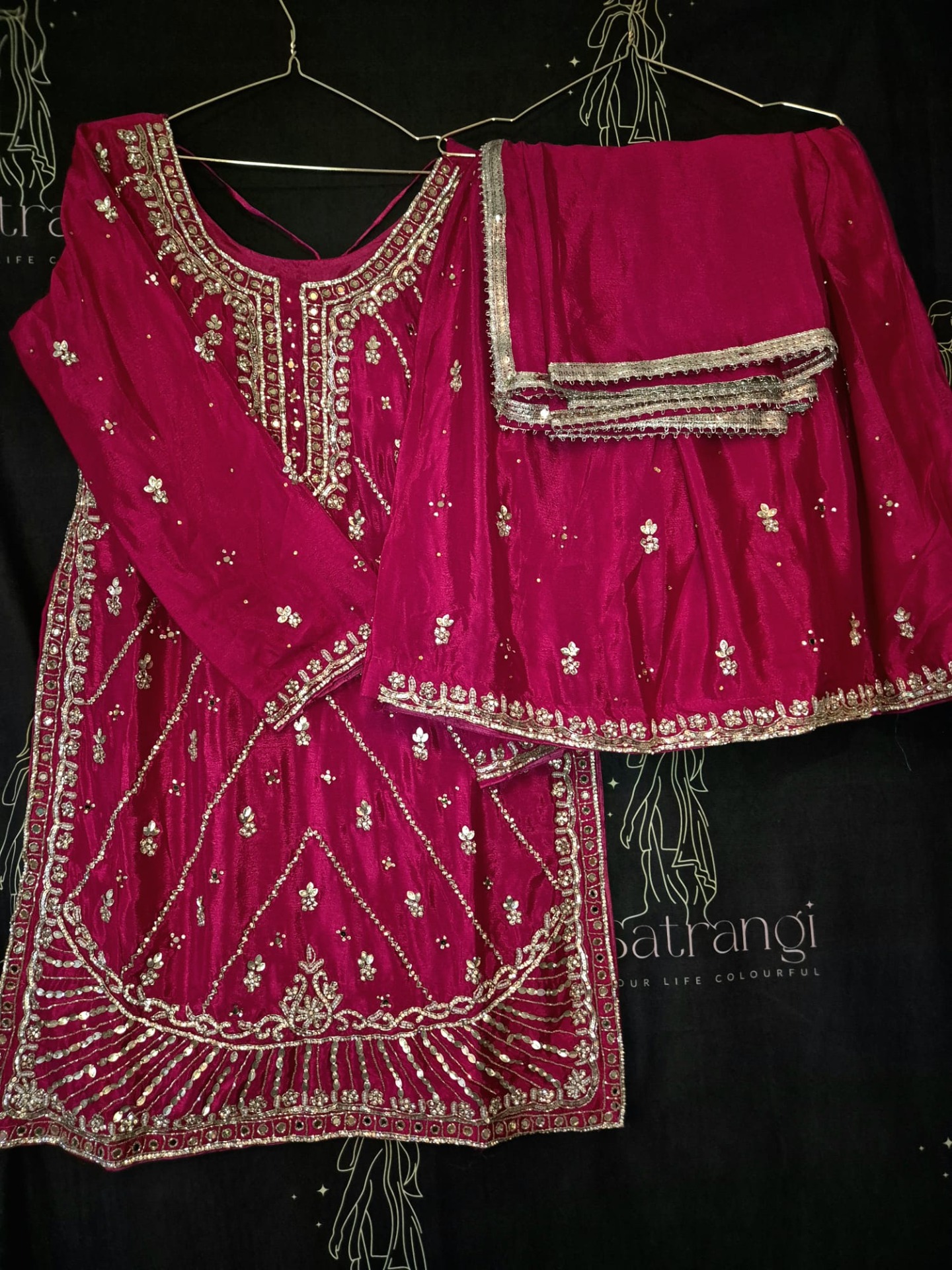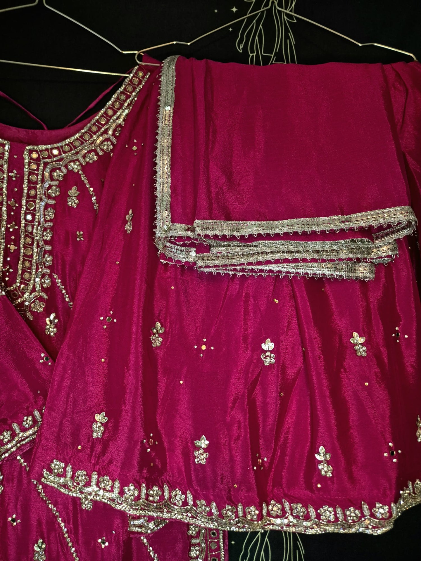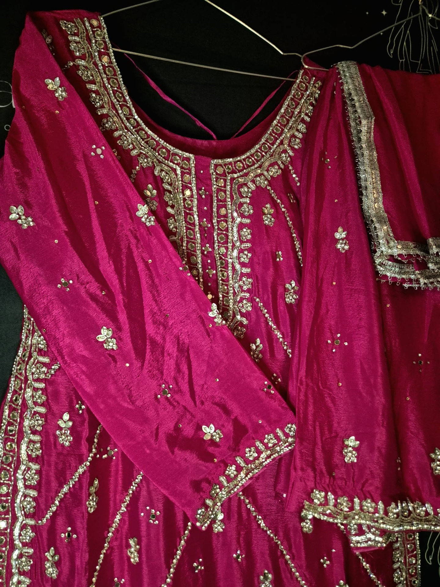 Embroidery: The top is richly adorned with intricate silver zari, thread, and sequin embroidery featuring a blend of geometric and floral patterns. The neckline is elegantly detailed with fine embroidery, while the body showcases subtle motifs arranged diagonally. The hemline is finished with a wide, ornate embroidered border with decorative lines and fine detailing. The pants feature subtle silver motifs and a decorative hem. The dupatta is finished with a refined silver border.