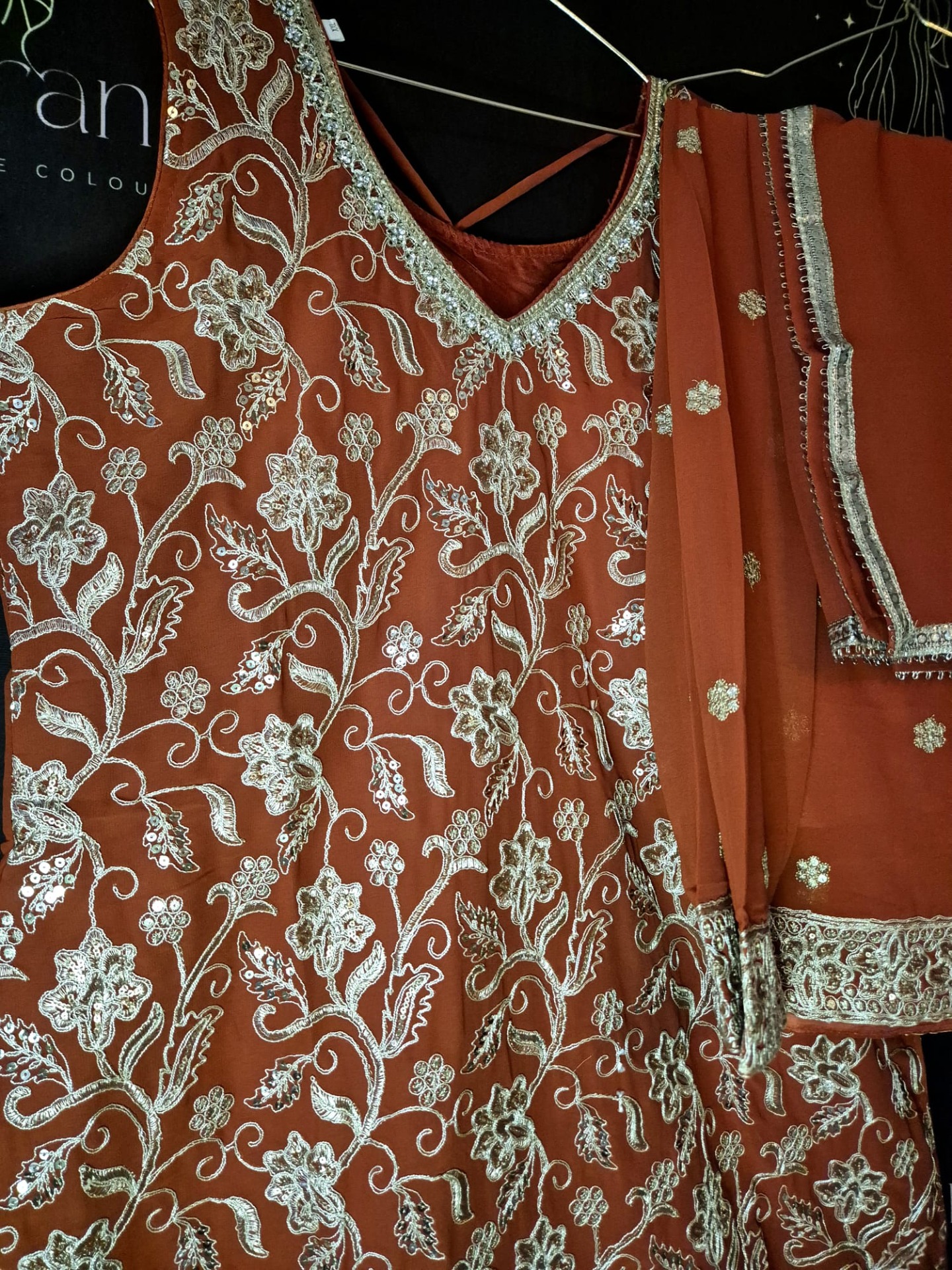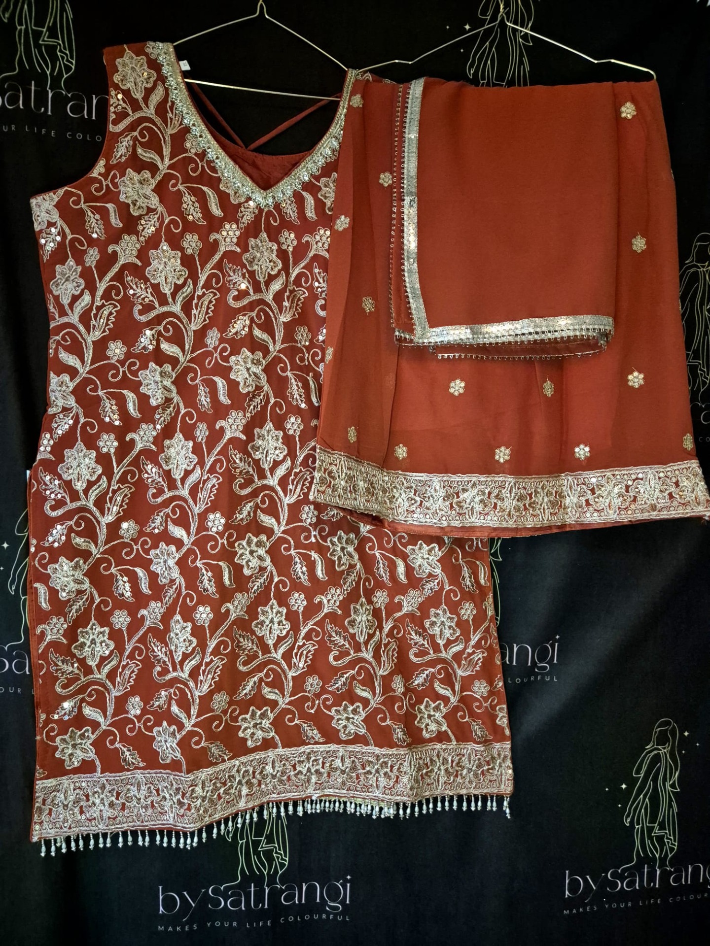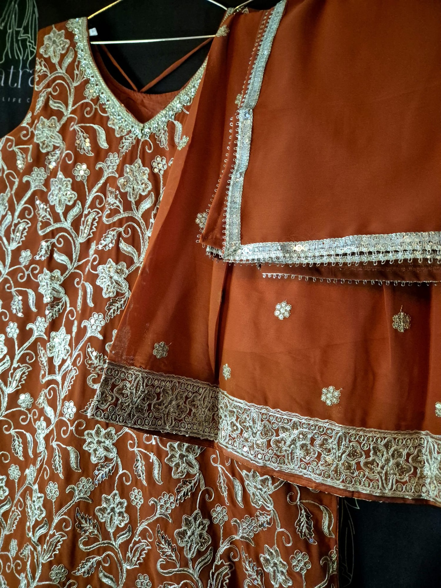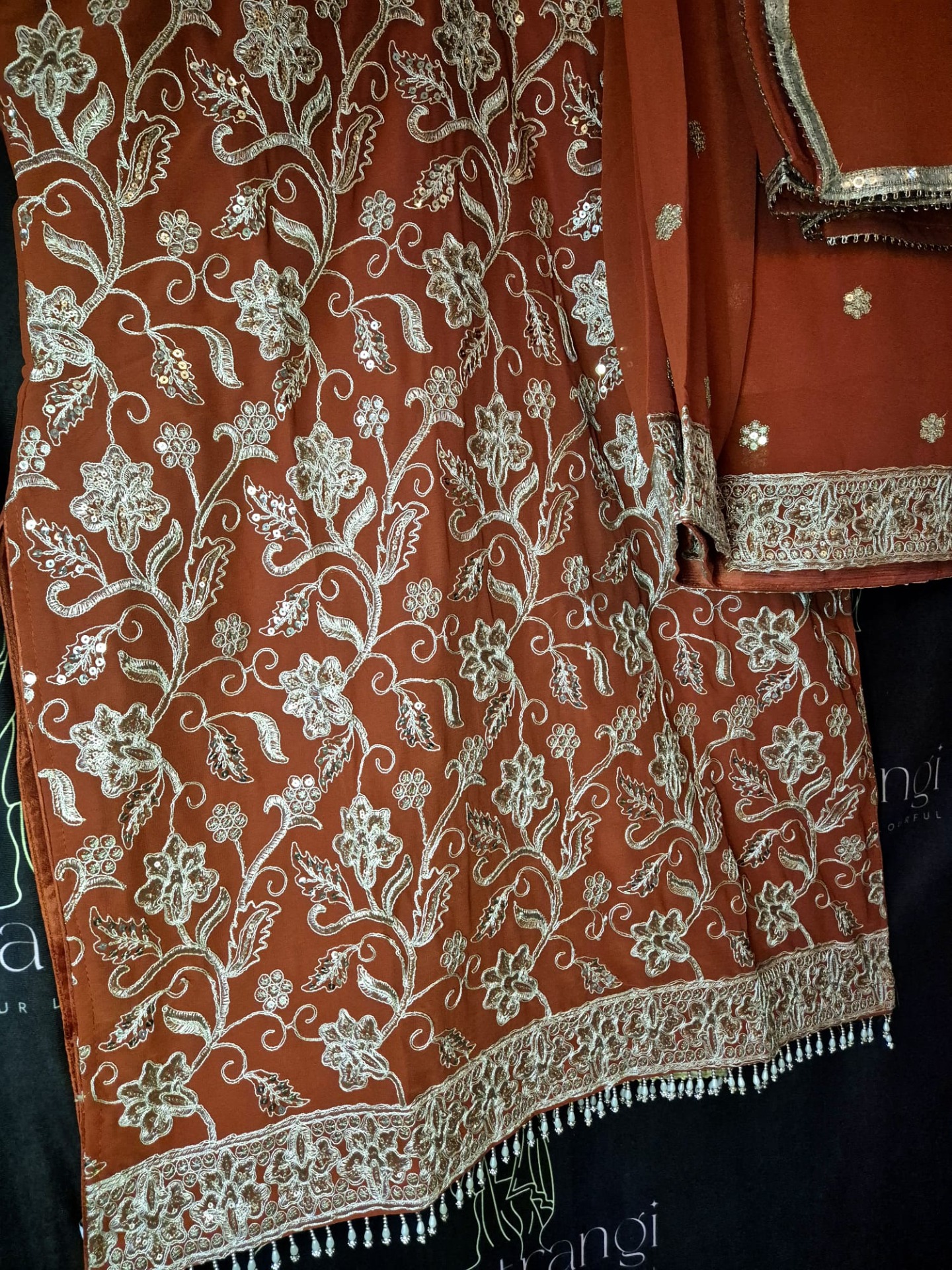 Embroidery: The top is richly adorned with intricate silver-toned embroidery featuring floral and vine motifs throughout. The neckline is elegantly detailed with fine embroidery, while the hem is finished with a wide, ornate embroidered border and delicate hanging accents for a luxurious look. The pants feature subtle silver embroidery details that complement the overall design. The dupatta is enhanced with a refined silver border.