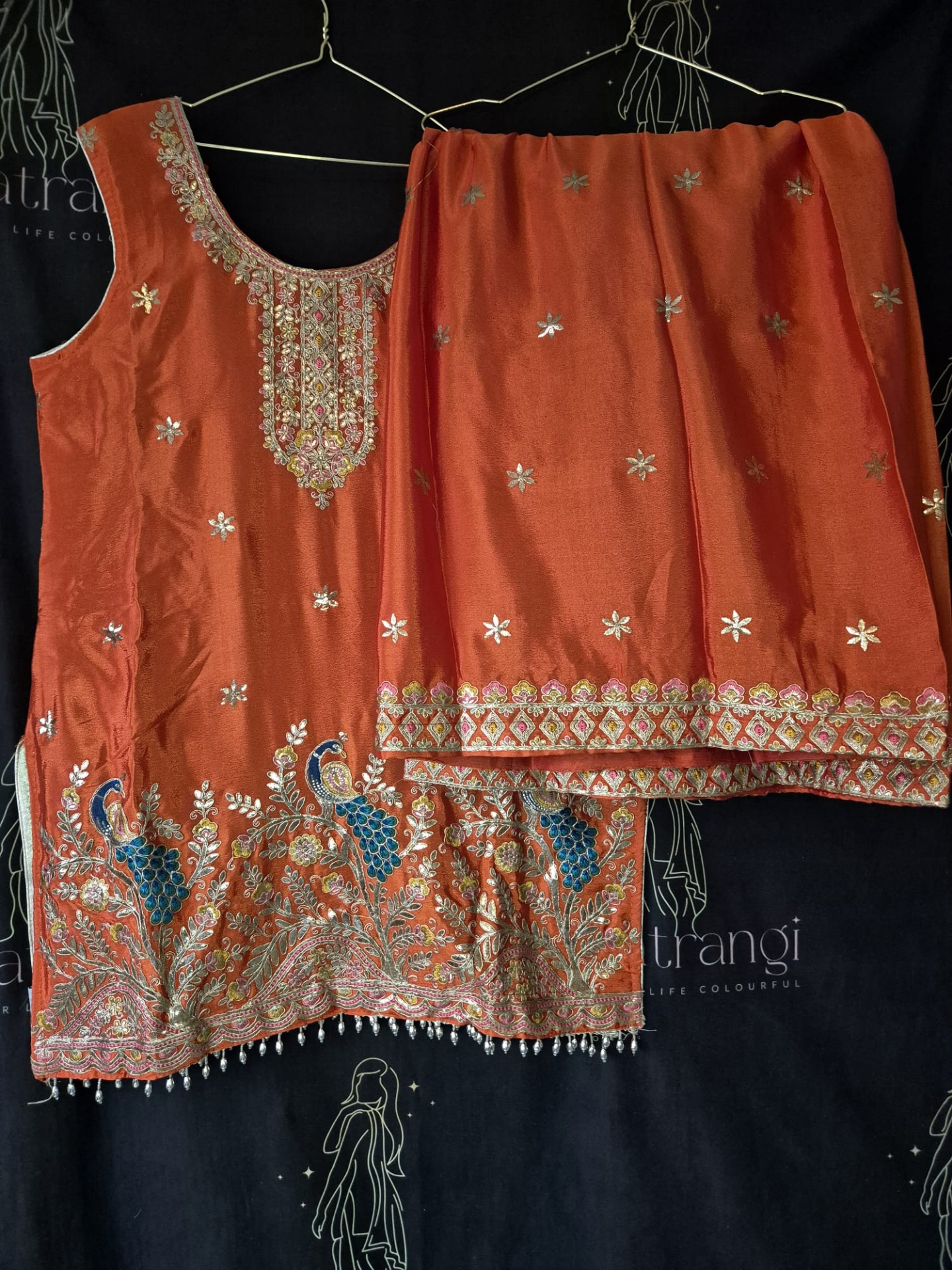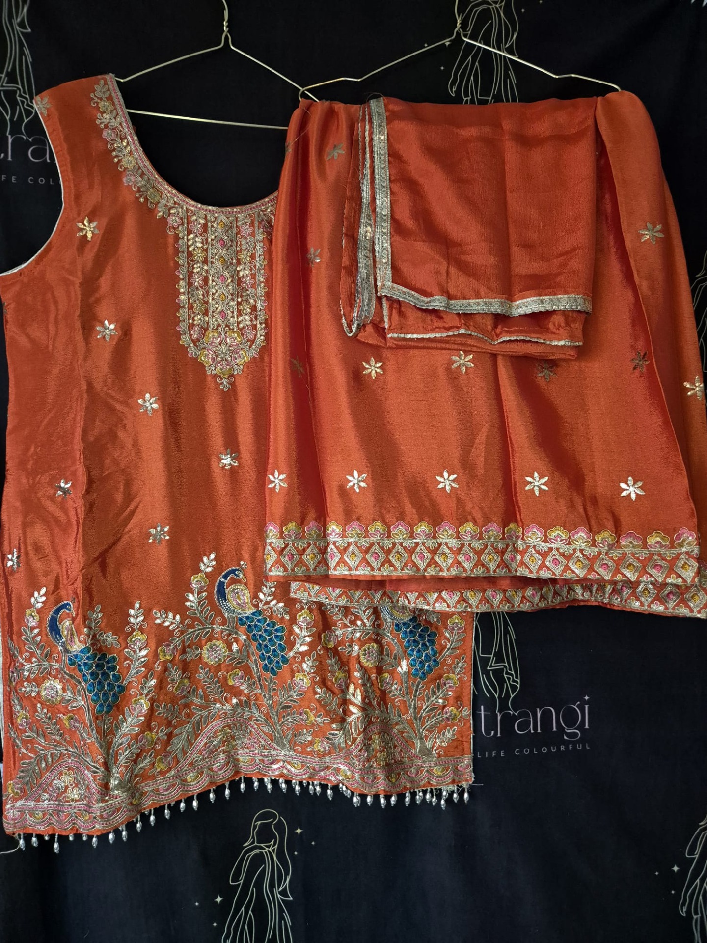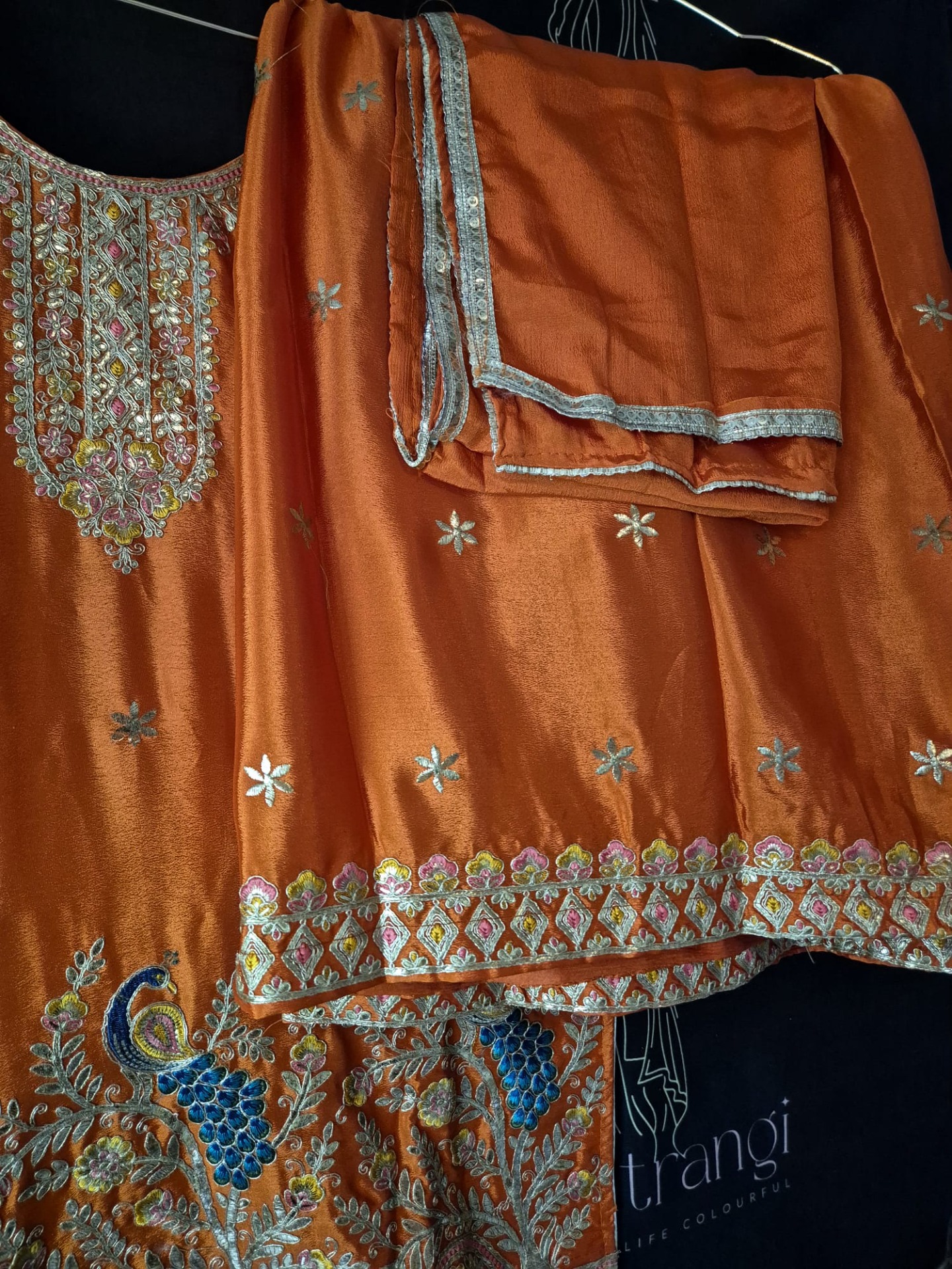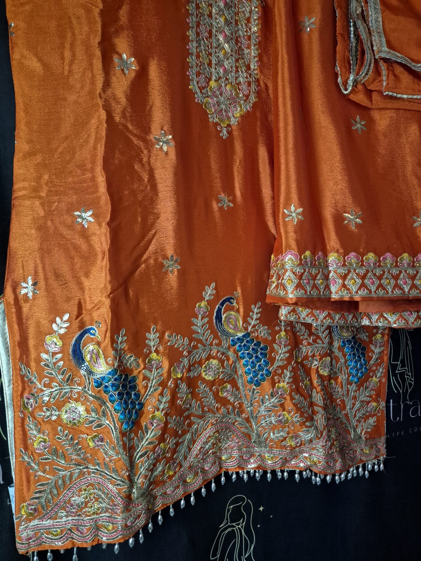 Embroidery: The top is richly adorned with intricate embroidery featuring floral motifs, complemented by decorative peacock designs in shades of blue and gold. The neckline is elegantly detailed with fine embroidery and subtle color accents. The hemline is finished with an ornate embellished border with beads and delicate hanging details, creating a luxurious and festive look. The pants feature a decorative embroidered border that complements the top. The dupatta is finished with a subtle decorative edge.