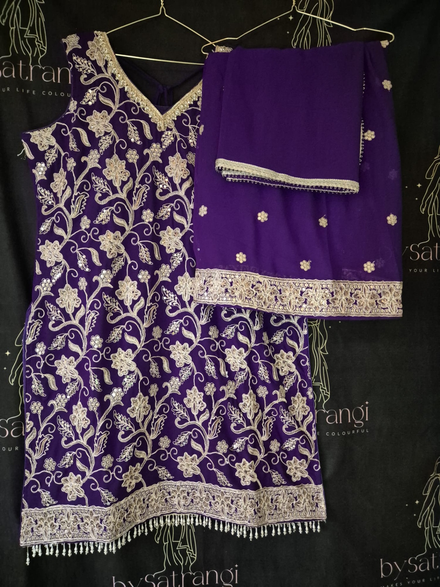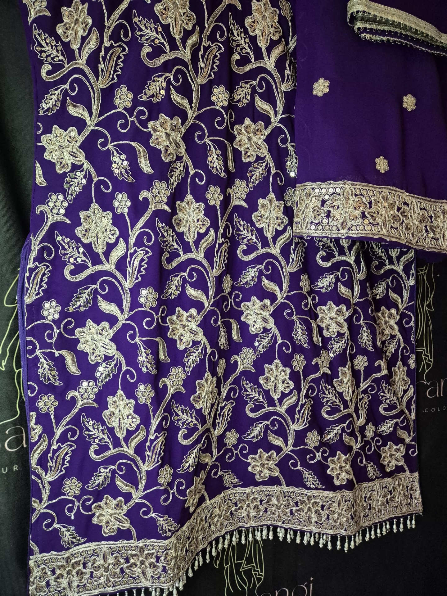 Embroidery: The top is richly adorned with intricate silver-toned embroidery featuring floral and vine motifs throughout. The neckline is elegantly detailed with fine embroidery, while the hem is finished with a wide, ornate embroidered border and delicate hanging accents for a luxurious look. The pants feature subtle silver embroidery details that complement the overall design. The dupatta is enhanced with a refined silver border.