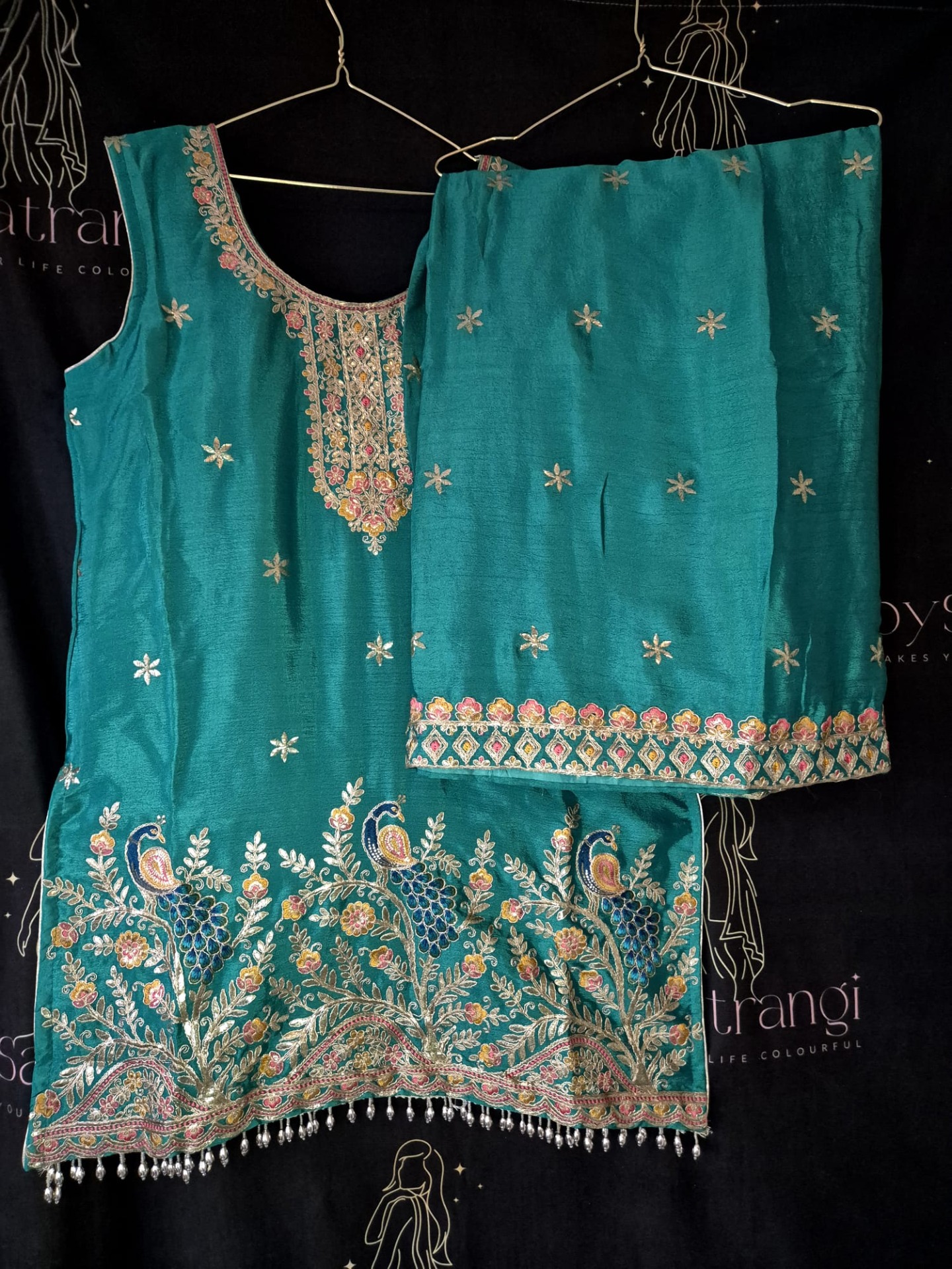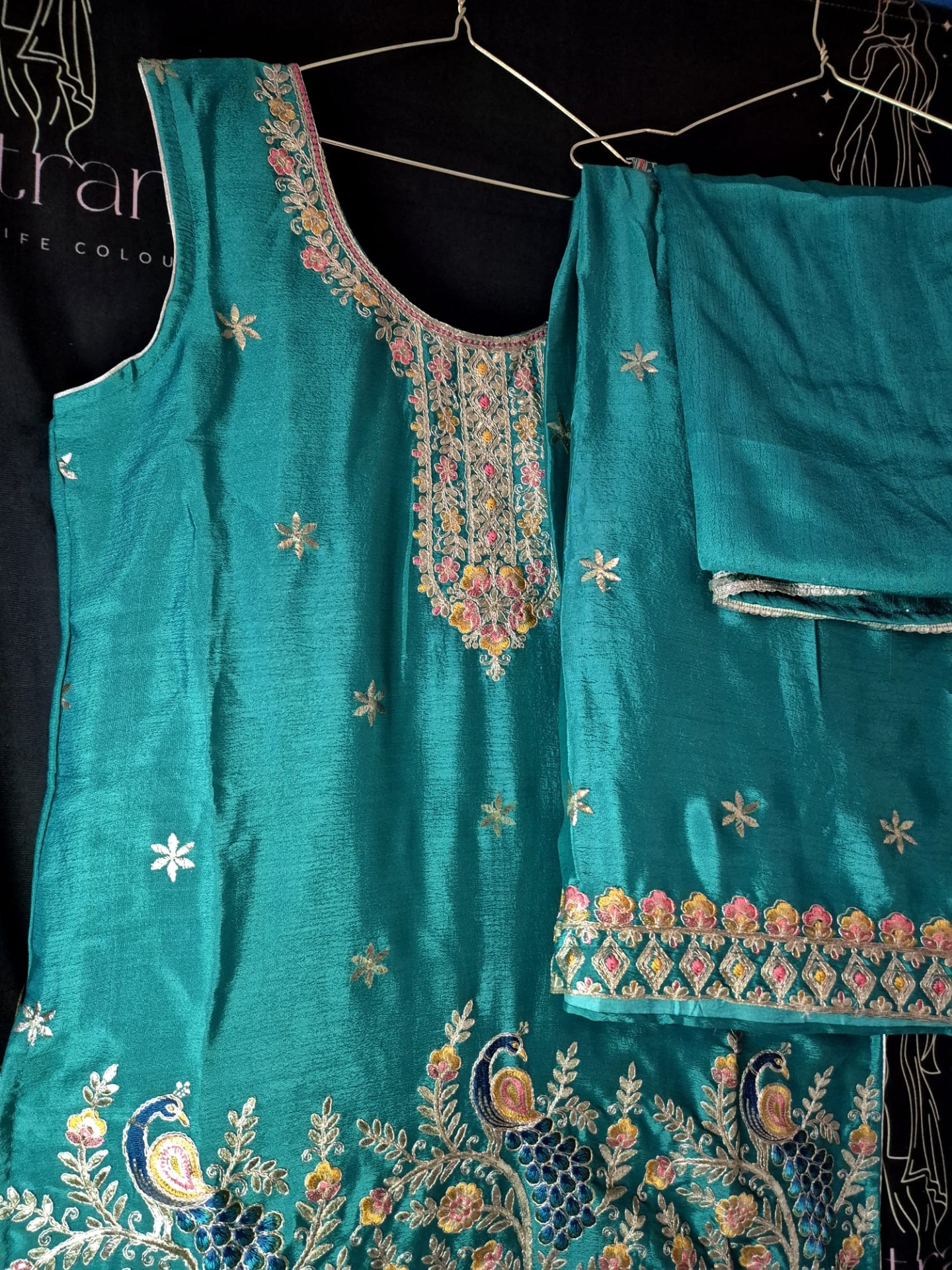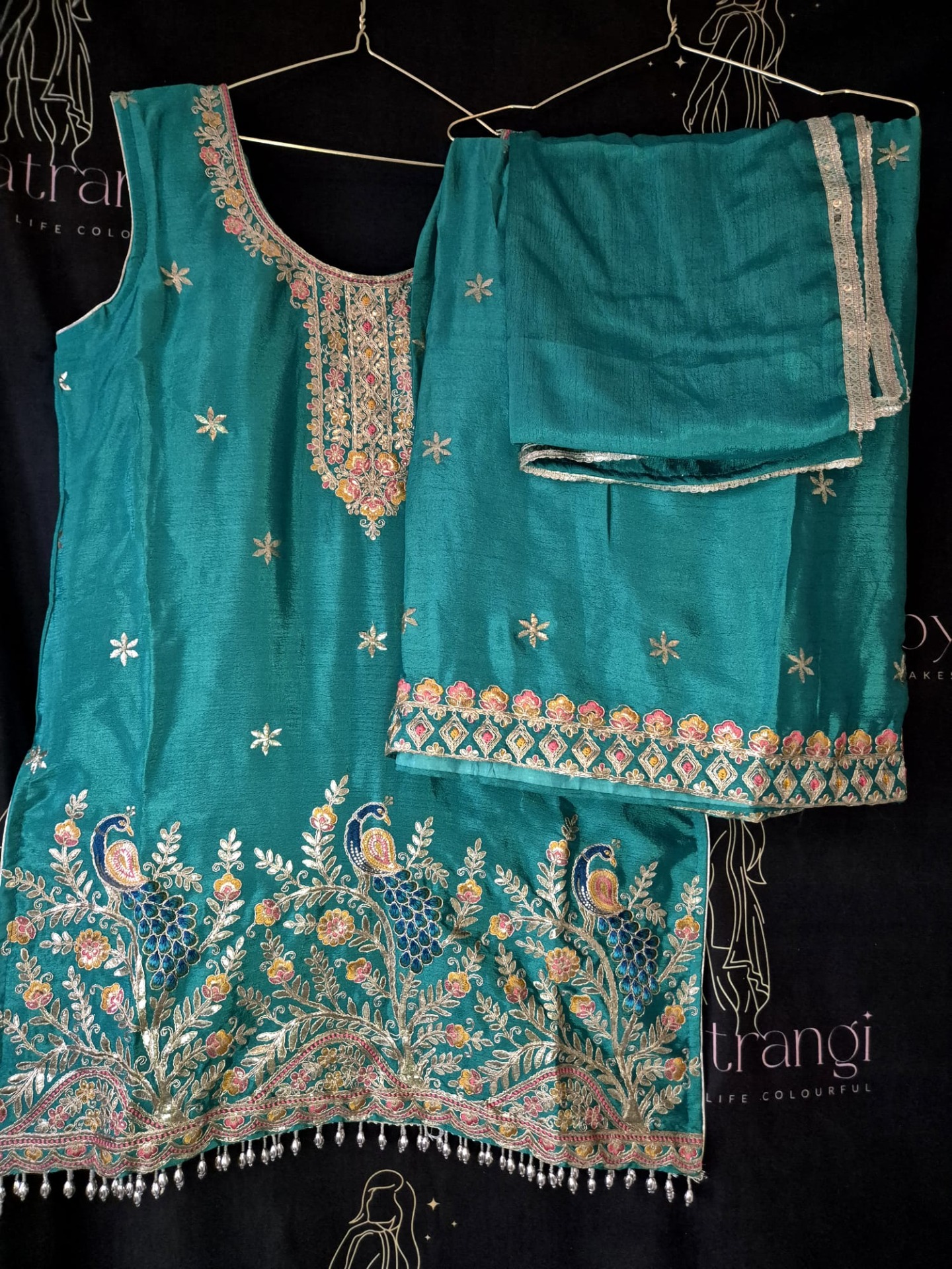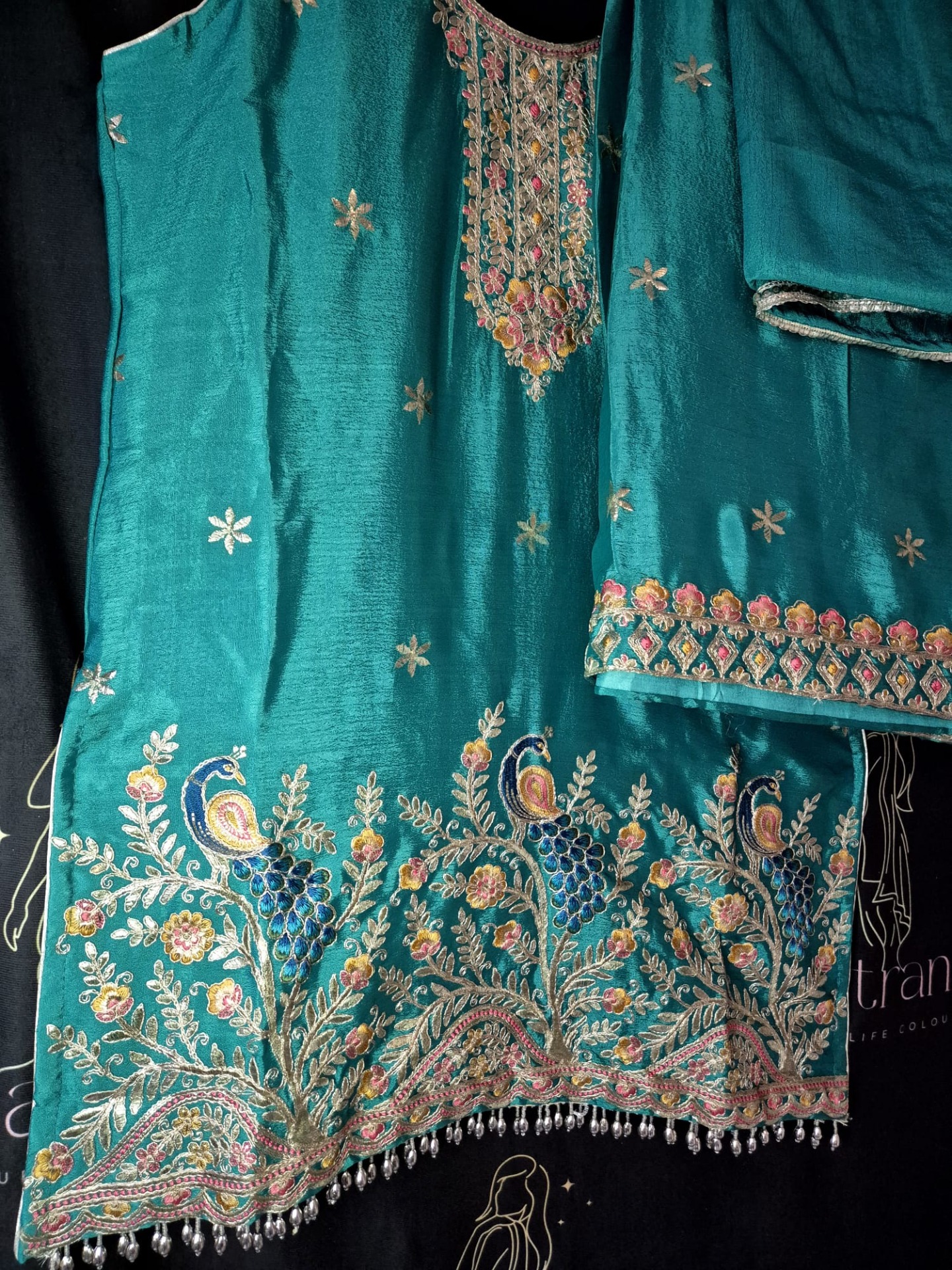 Embroidery: The top is richly adorned with intricate embroidery featuring floral motifs, complemented by decorative peacock designs in shades of blue and gold. The neckline is elegantly detailed with fine embroidery and subtle color accents. The hemline is finished with an ornate embellished border with beads and delicate hanging details, creating a luxurious and festive look. The pants feature a decorative embroidered border that complements the top. The dupatta is finished with a subtle decorative edge.
