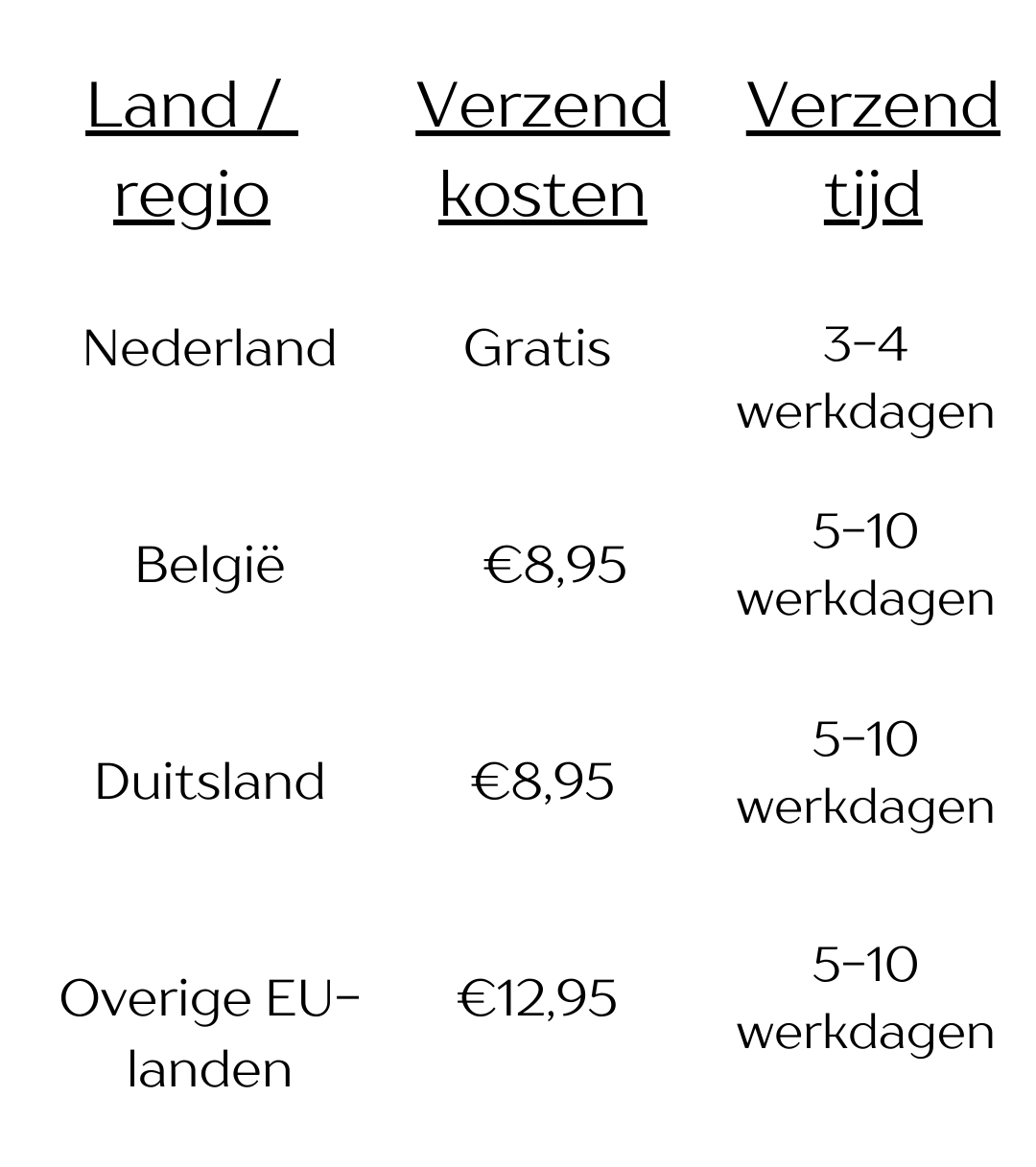 Wij doen ons best om jouw bestelling zo snel en zorgvuldig mogelijk bij je te bezorgen. Bestellingen worden met zorg verwerkt en verzonden via betrouwbare vervoerders. Hieronder vind je een overzicht van de verzendkosten en verwachte levertijden per bestemming.
